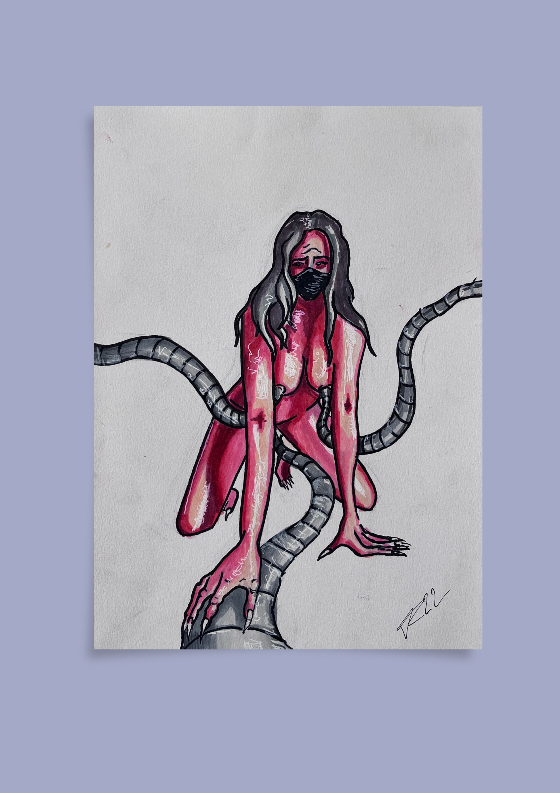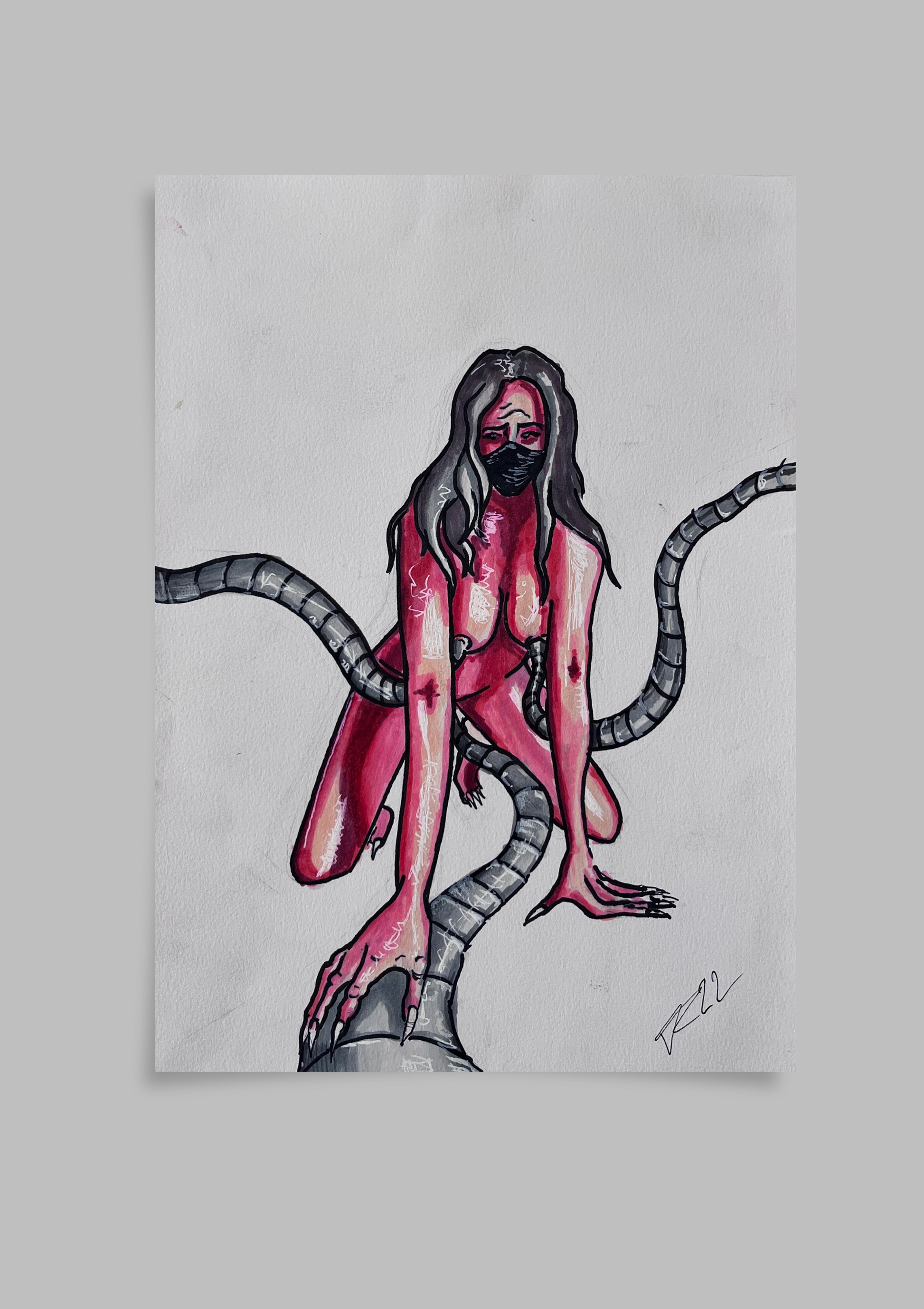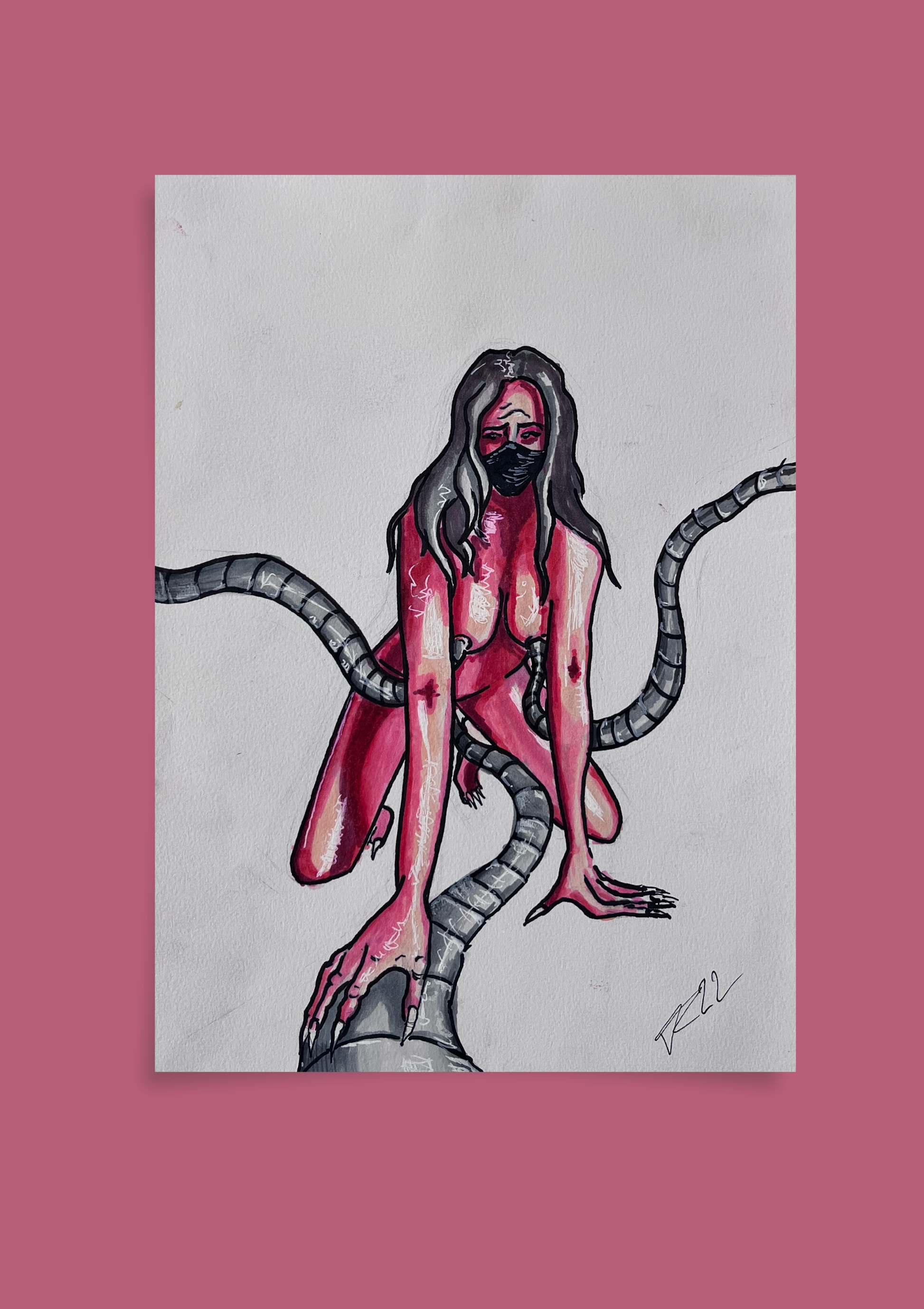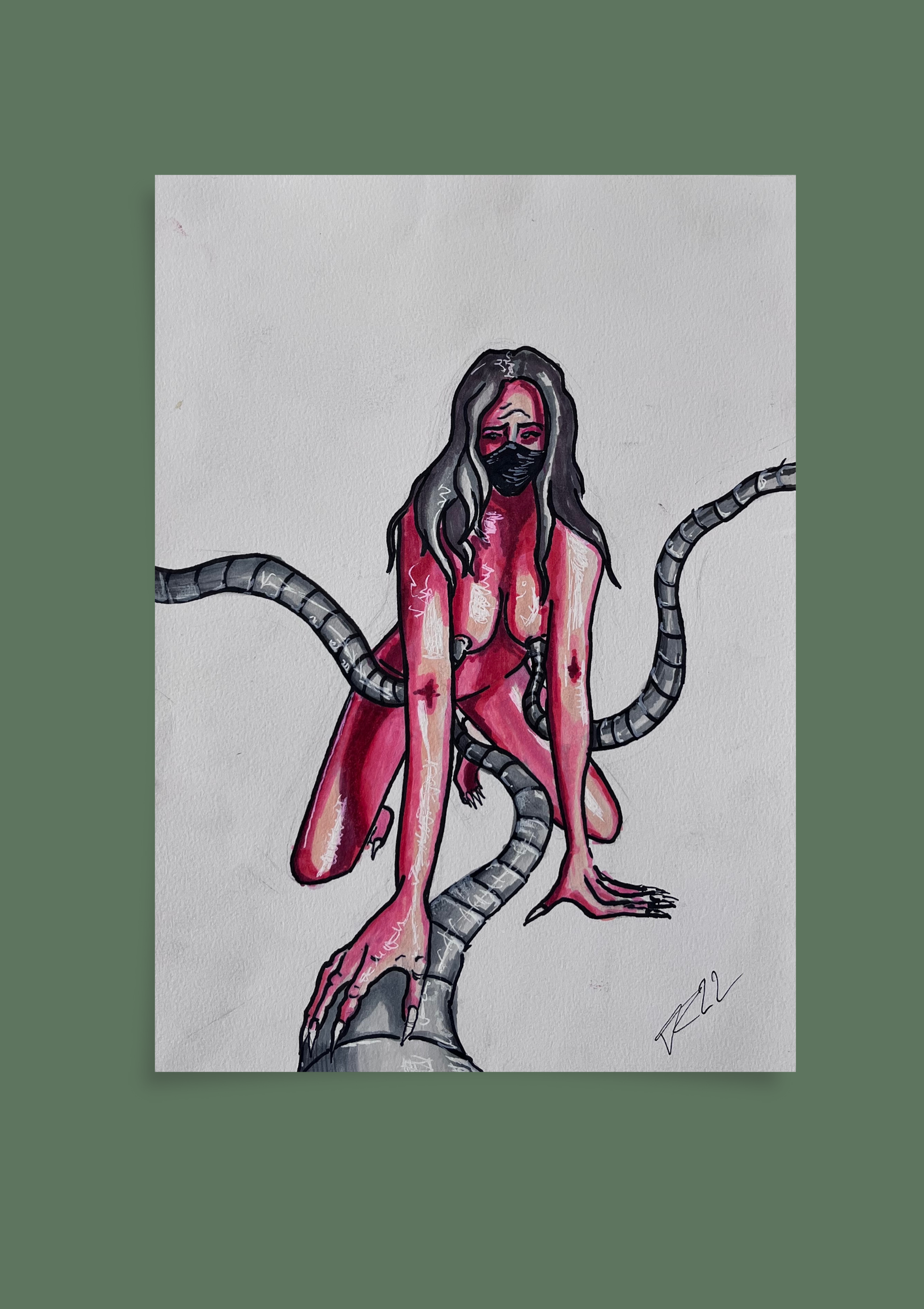 „Atmen im Widerstand“ zeigt eine nackte Frau, deren Haut in intensiven Rottönen leuchtet. Ihr Körper ist umschlungen von metallisch anmutenden Schläuchen oder Tentakeln, die sie festhalten, einschränken und gleichzeitig durchdringen. Das Gesicht ist von einer schwarzen Maske bedeckt – Symbol für Unterdrückung, Sprachlosigkeit und das Ringen nach Luft.