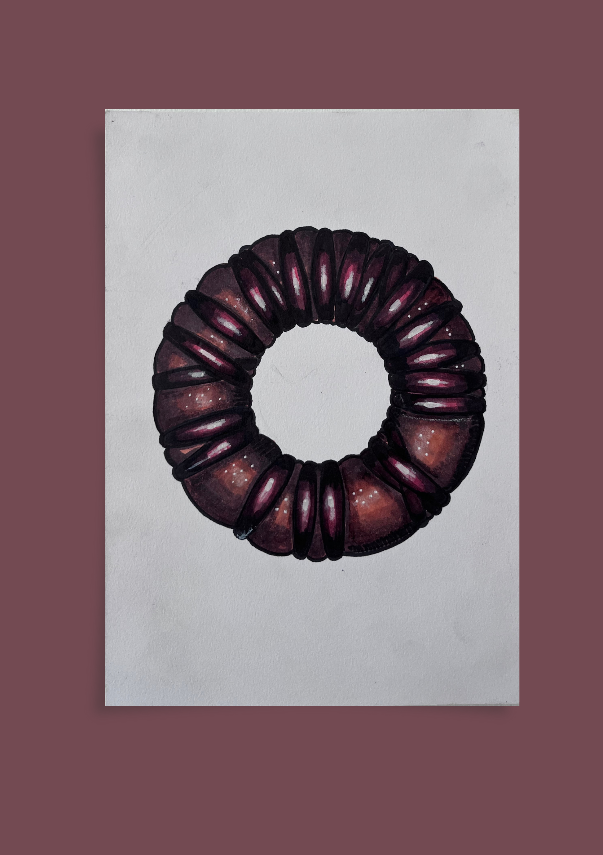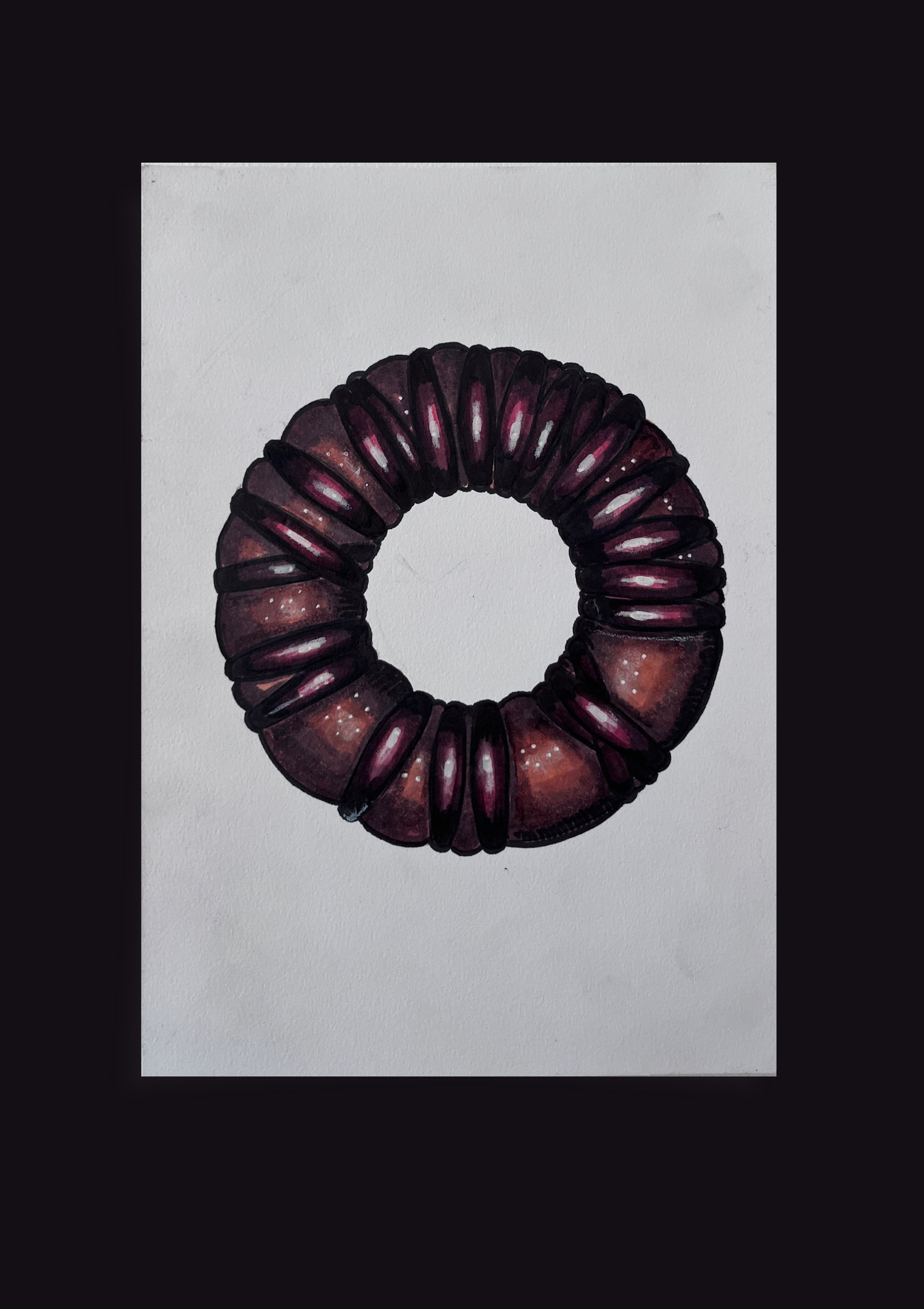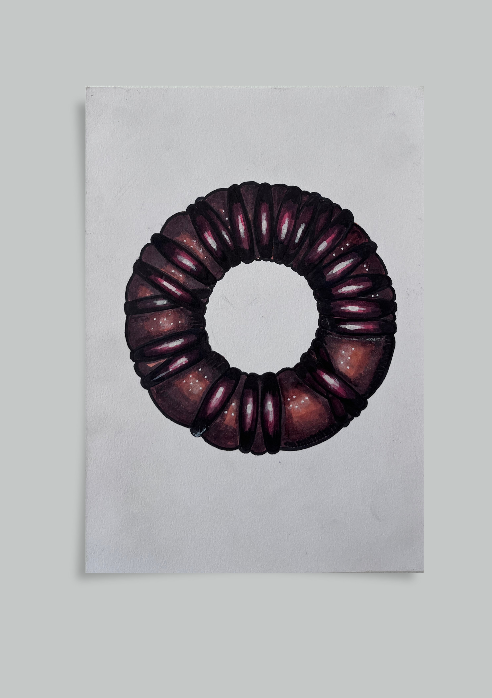 Das Werk zeigt eine runde Form, die wie eine endlose Wurstschlange in sich zurückläuft und so einen Kreis bildet. Mit tiefen Braun- und Violetttönen, betonten Glanzlichtern und plastischer Schattierung entsteht eine fast skulpturale Wirkung. Humorvoll und zugleich ernsthaft verweist das Bild auf Themen wie Kreislauf, Wiederholung und Absurdität. Ein alltägliches Objekt wird verfremdet, bis es Symbolcharakter bekommt – roh, direkt und unverkennbar eigenwillig.