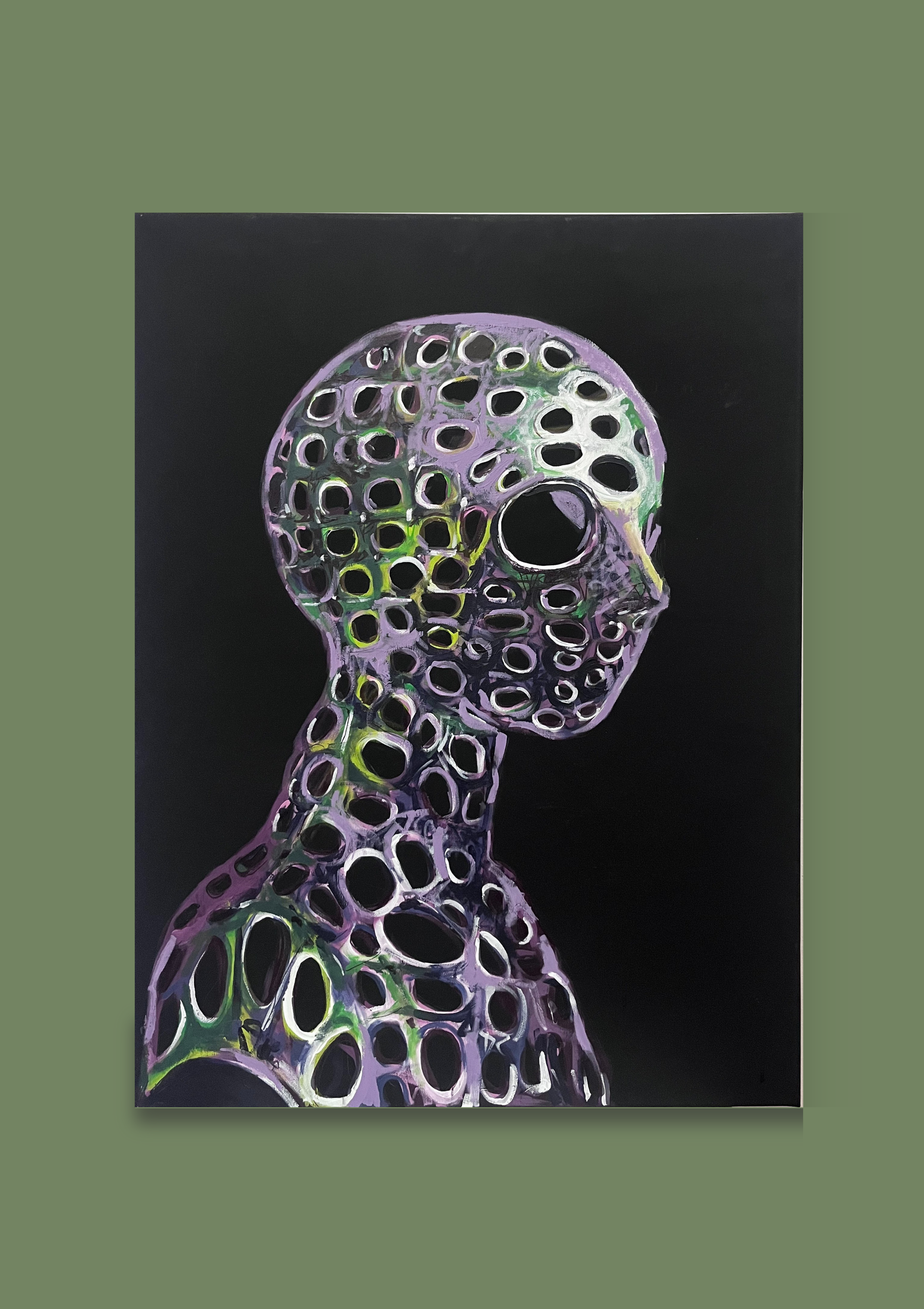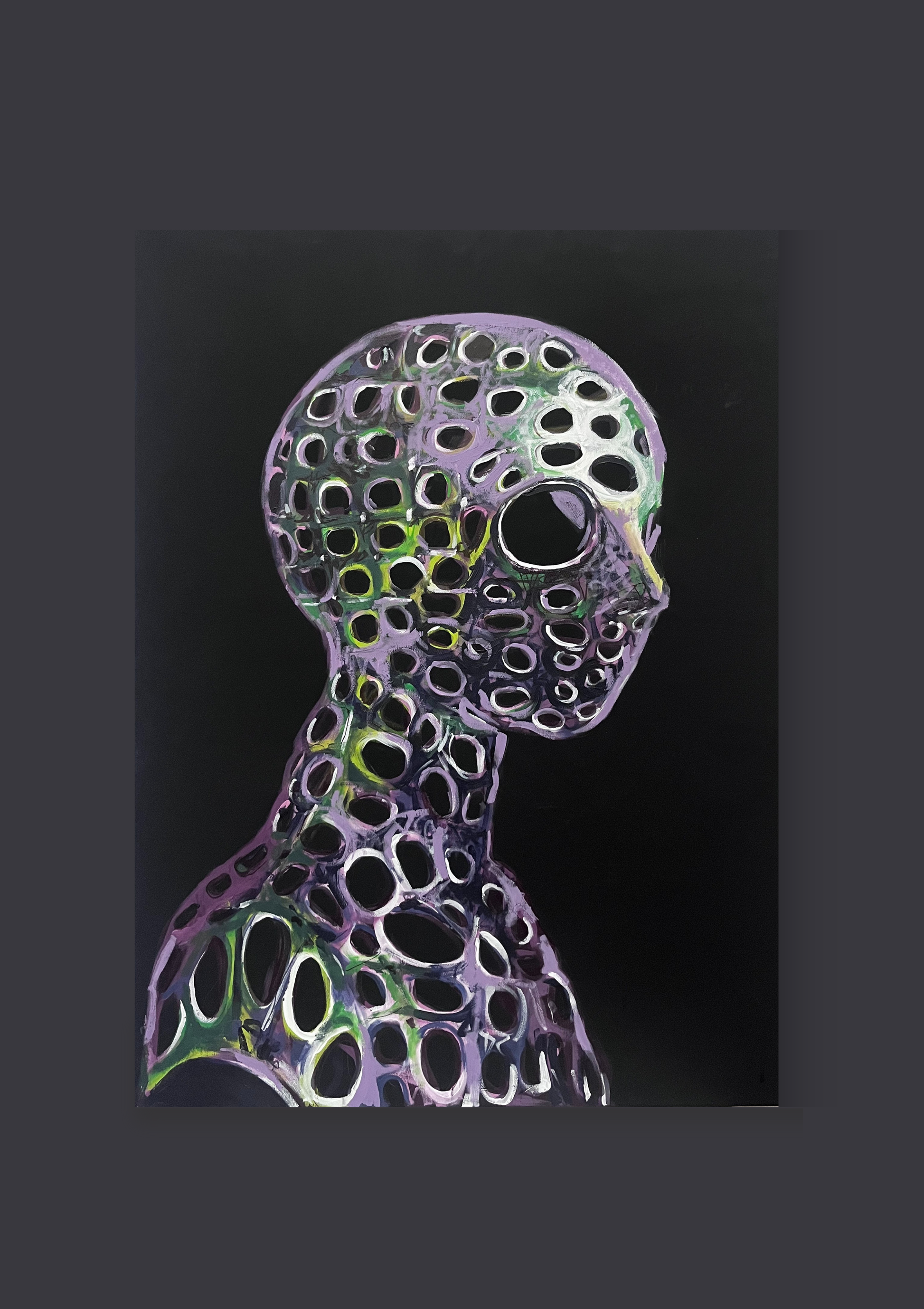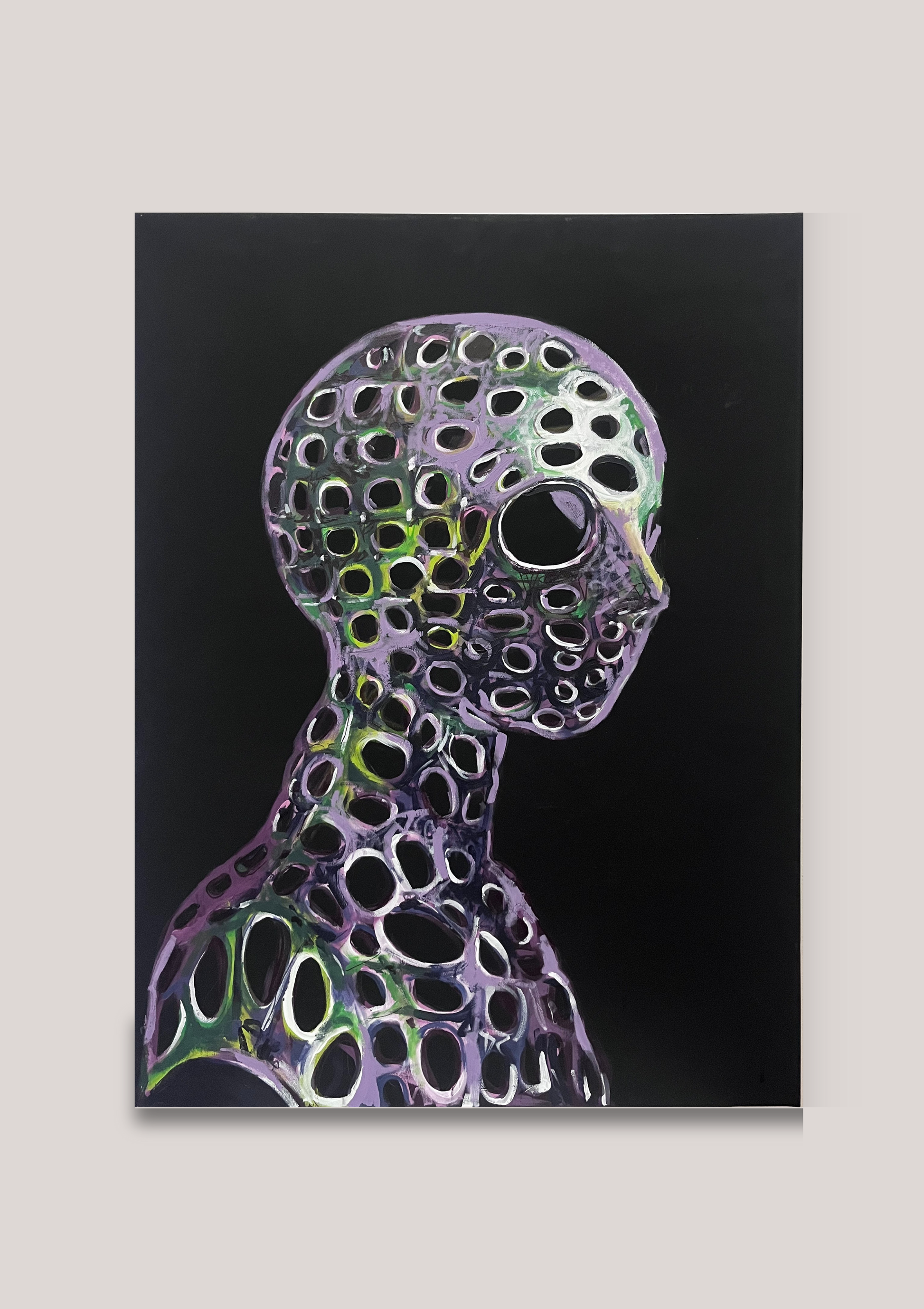 „Durchlässig“ ist ein kraftvolles Acrylgemälde auf tiefschwarzer Leinwand, das die Zerbrechlichkeit und Transparenz menschlicher Existenz erforscht.