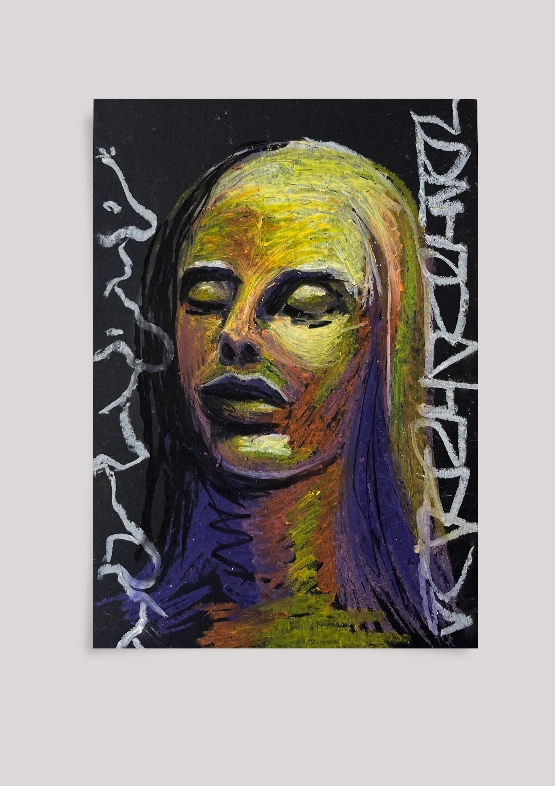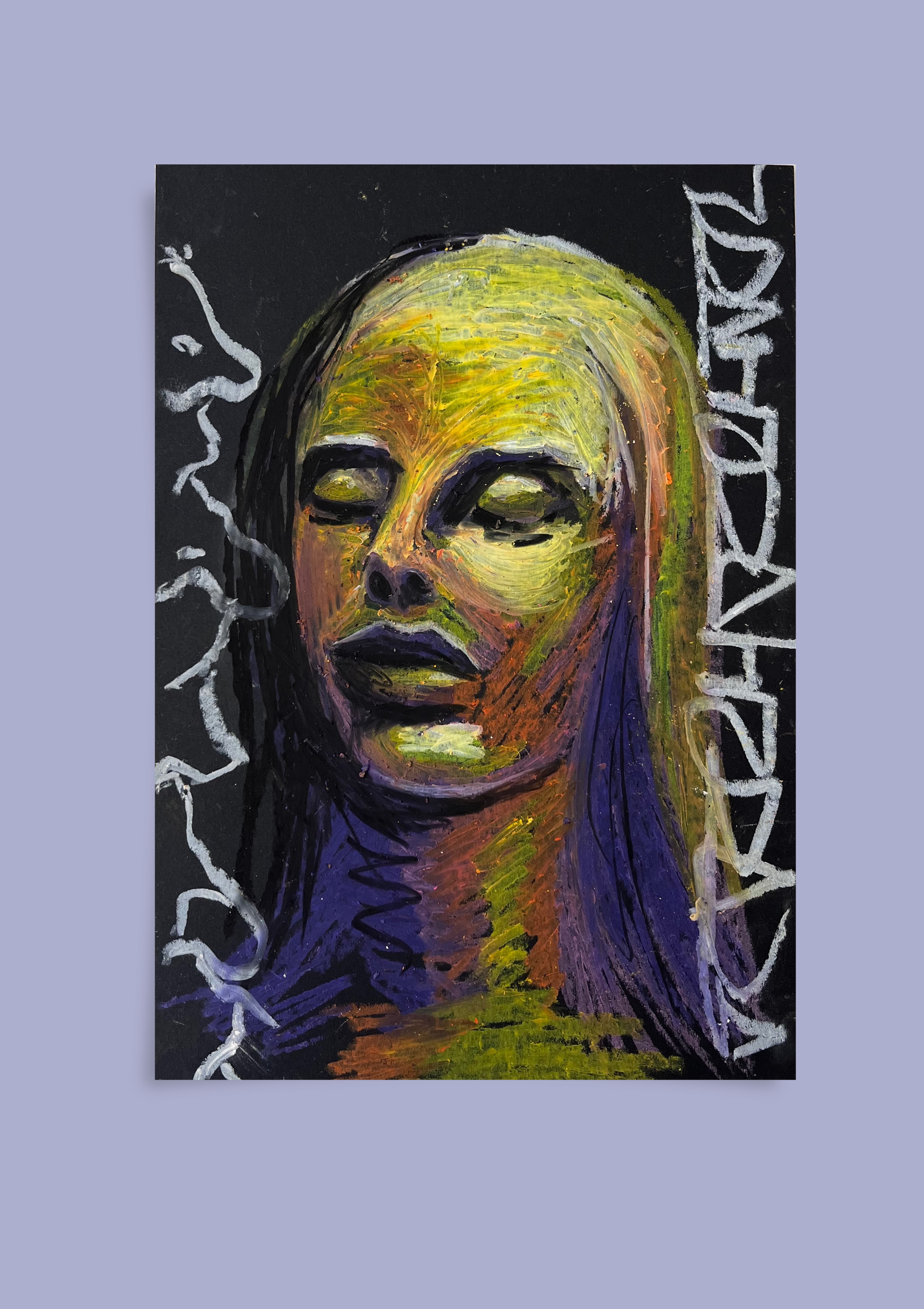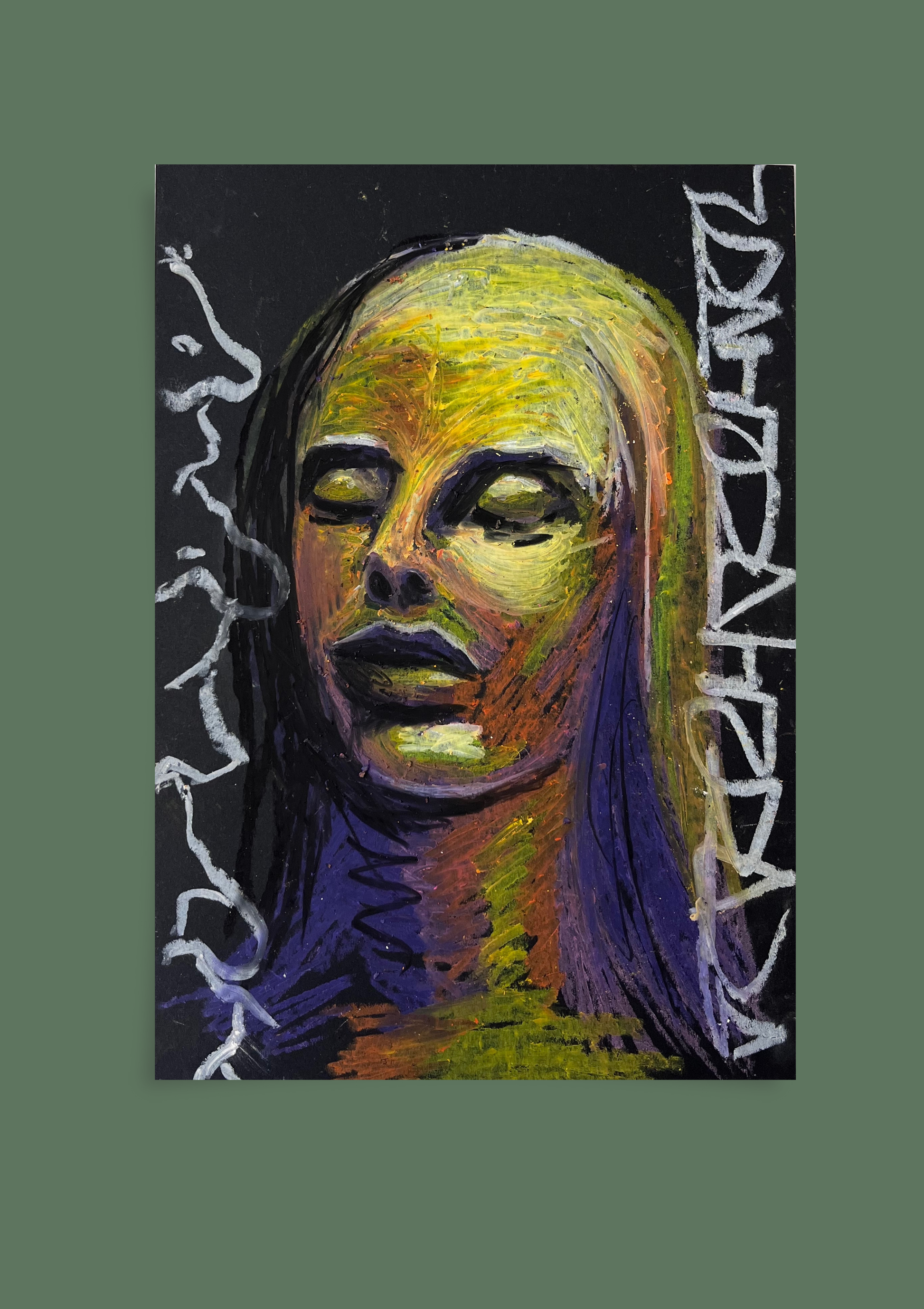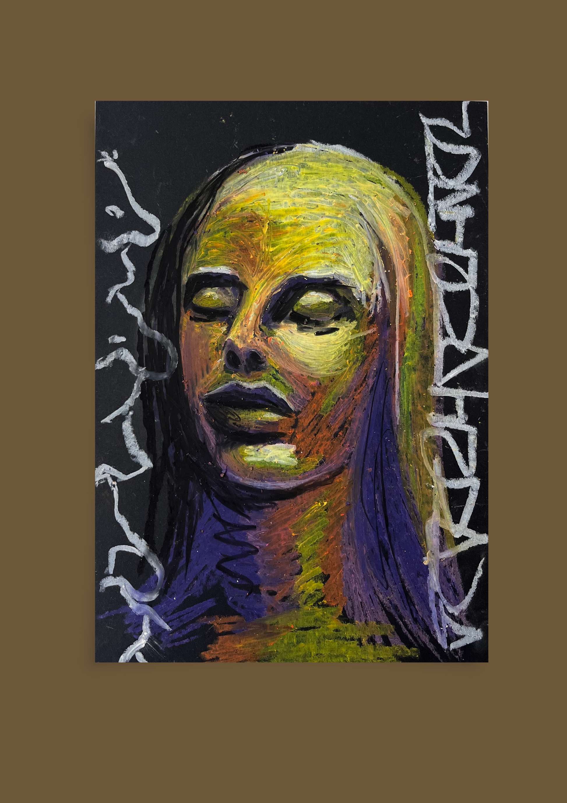 „Echo im Kopf 1“ zeigt ein geschlossenes Gesicht, das von leuchtendem Gelb, Violett und Schwarz durchzogen ist. Die Augen sind nach innen gerichtet, als ob die Person in sich hineinlauscht. Weiße, wellenartige Linien rahmen das Bild und wirken wie Schallwellen oder Gedankenfetzen – ein sichtbares Echo im Inneren.