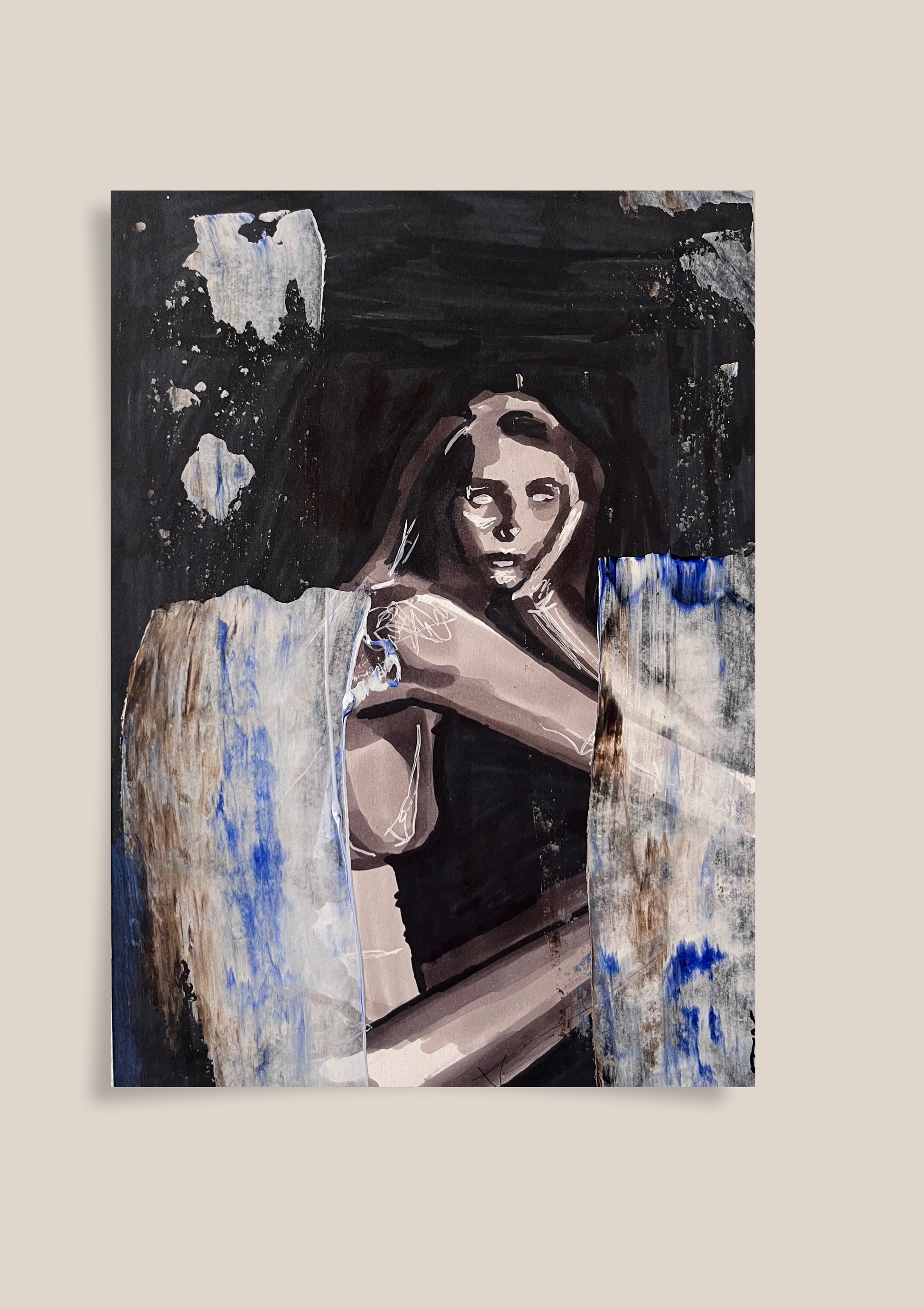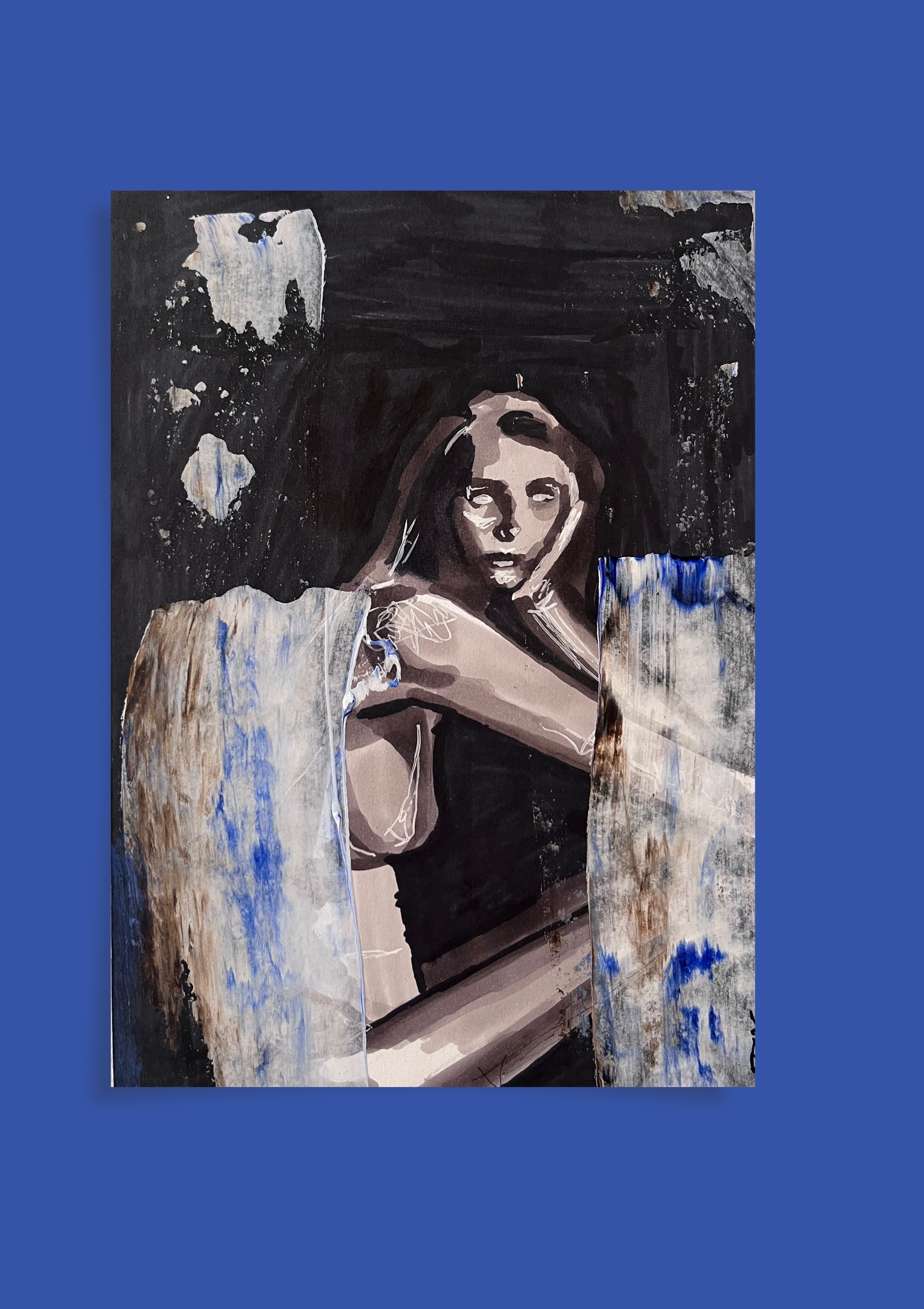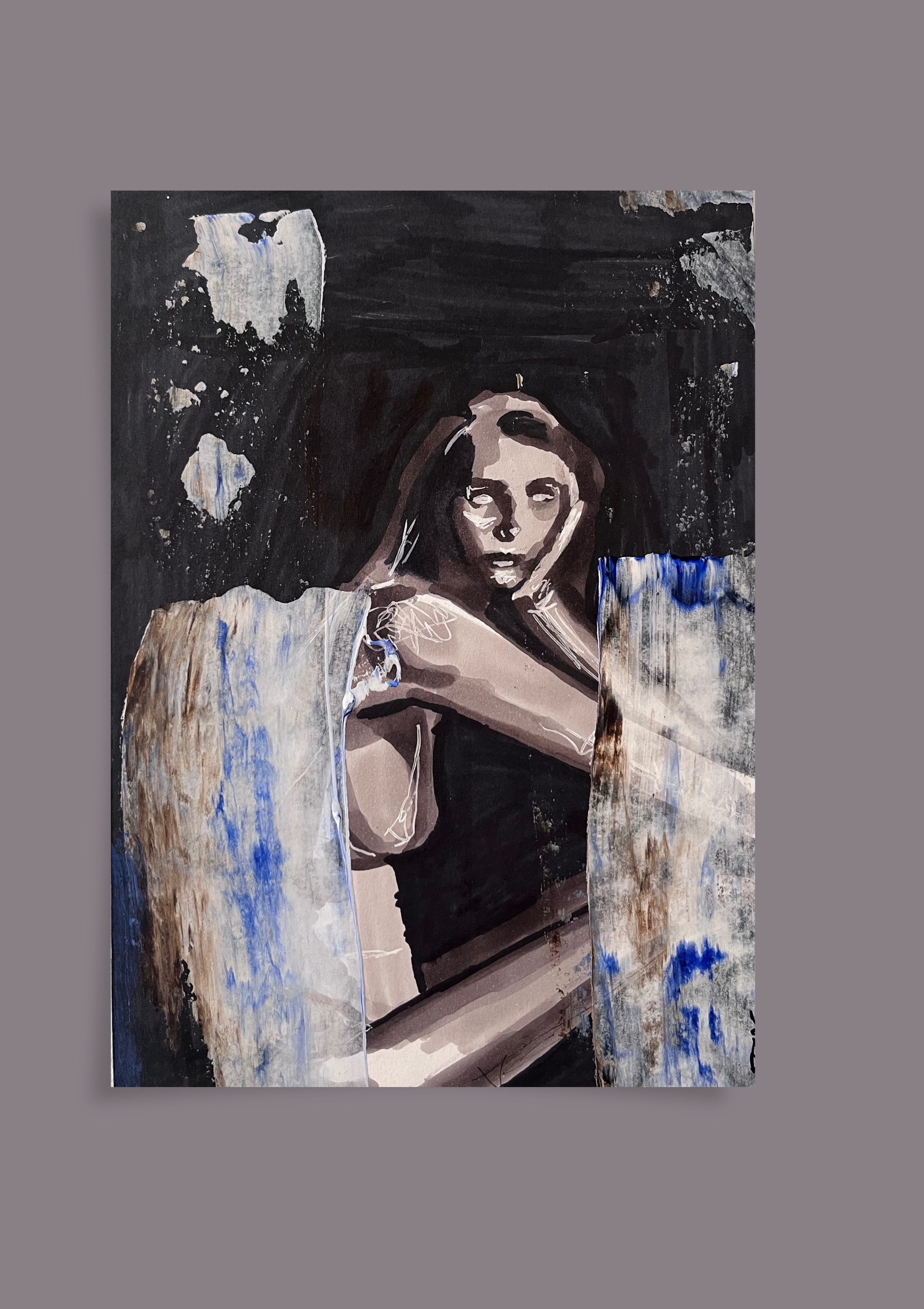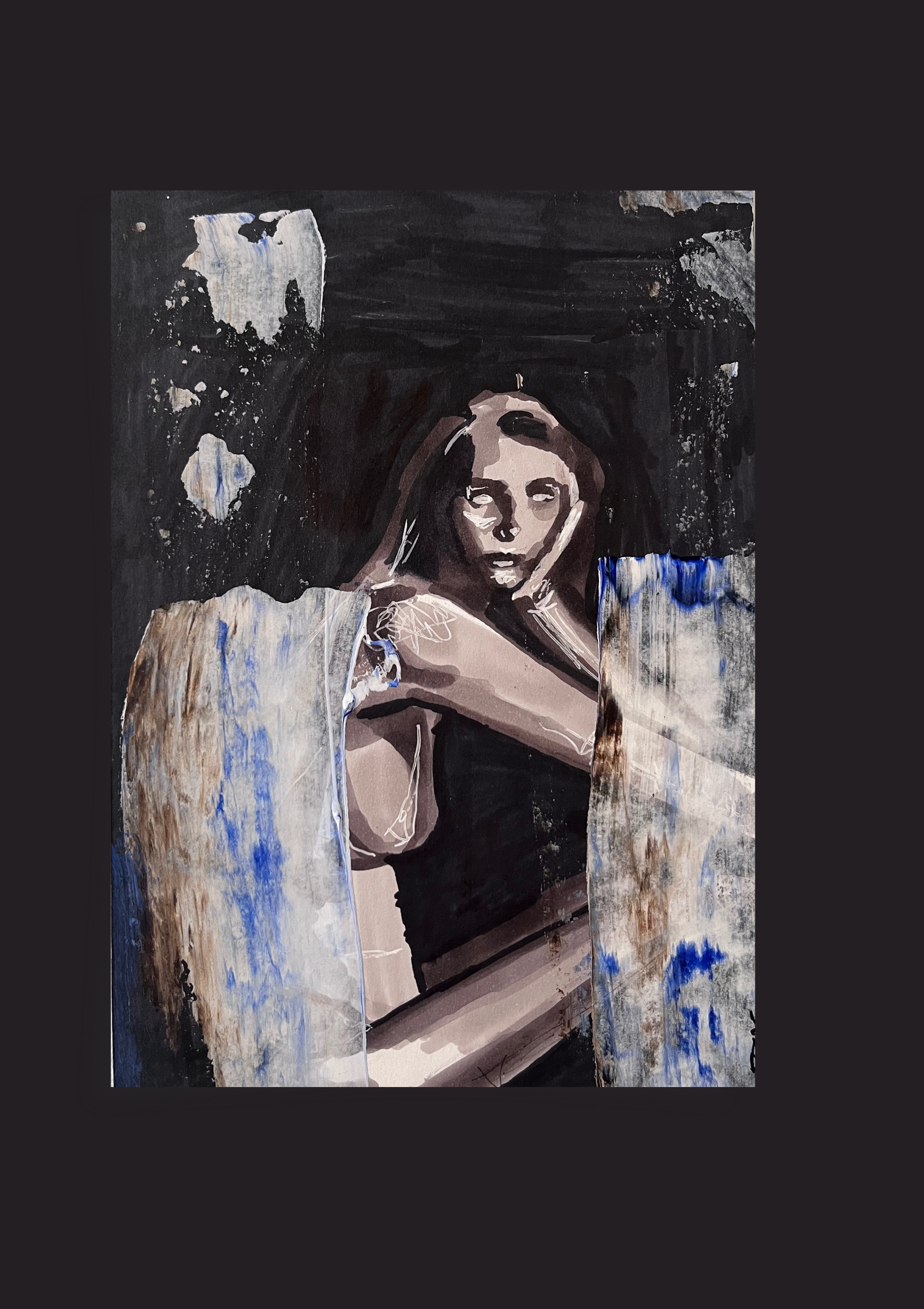 Das Werk „Erinnerung“ (A5, Marker auf Papier, überarbeitet mit Acryl) zeigt eine sitzende Frauenfigur, die in dunklen, erdigen Tönen gehalten ist. Ihr Körper und Gesicht erscheinen fragmentarisch, als würde sie aus dem Hintergrund heraus auftauchen und gleichzeitig wieder verschwinden. Die schwarze Grundfläche wird durch strukturierte Acrylüberlagerungen in Braun-, Weiß- und Blautönen aufgebrochen, wodurch eine fast verwitterte, schichtartige Oberfläche entsteht.