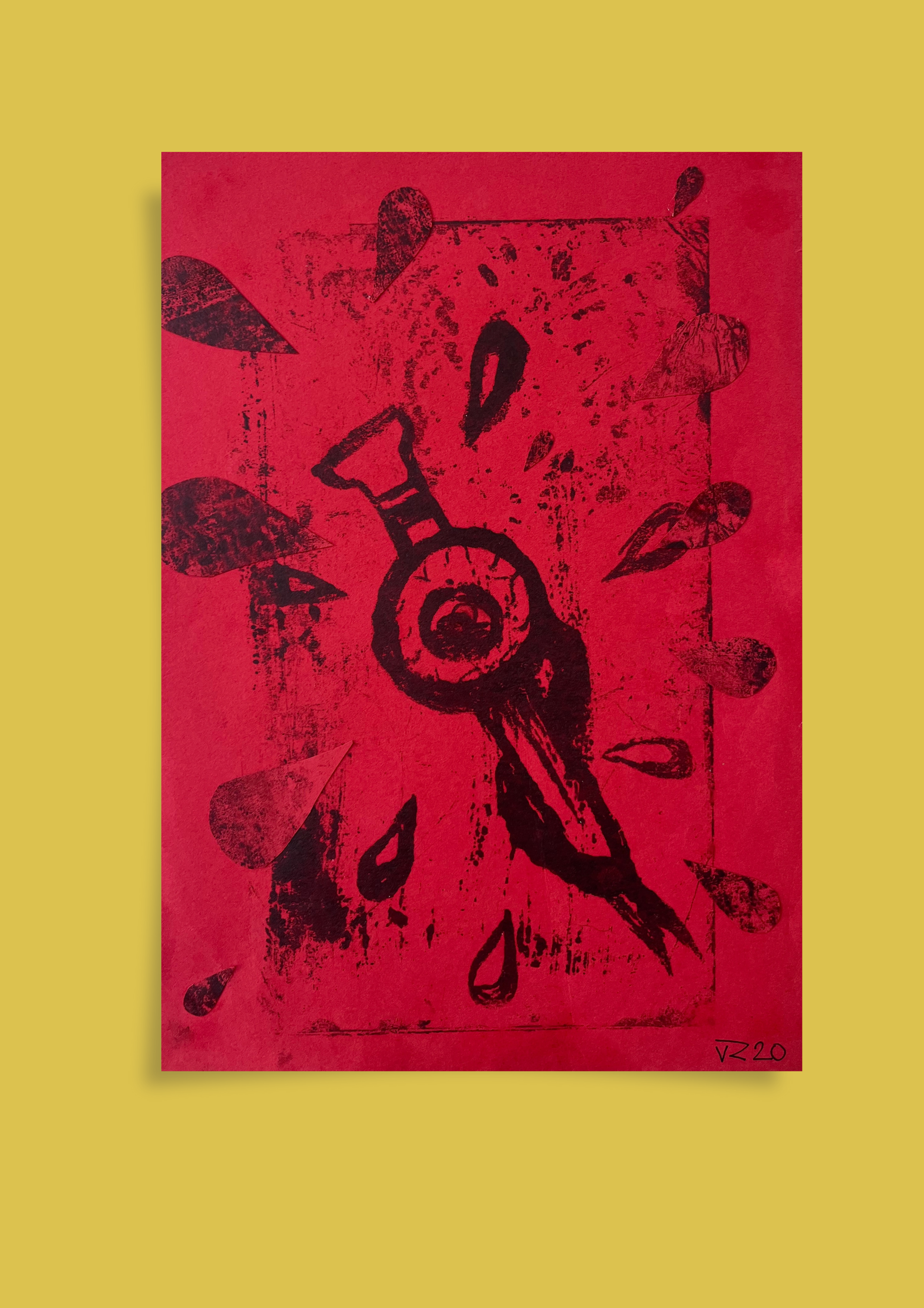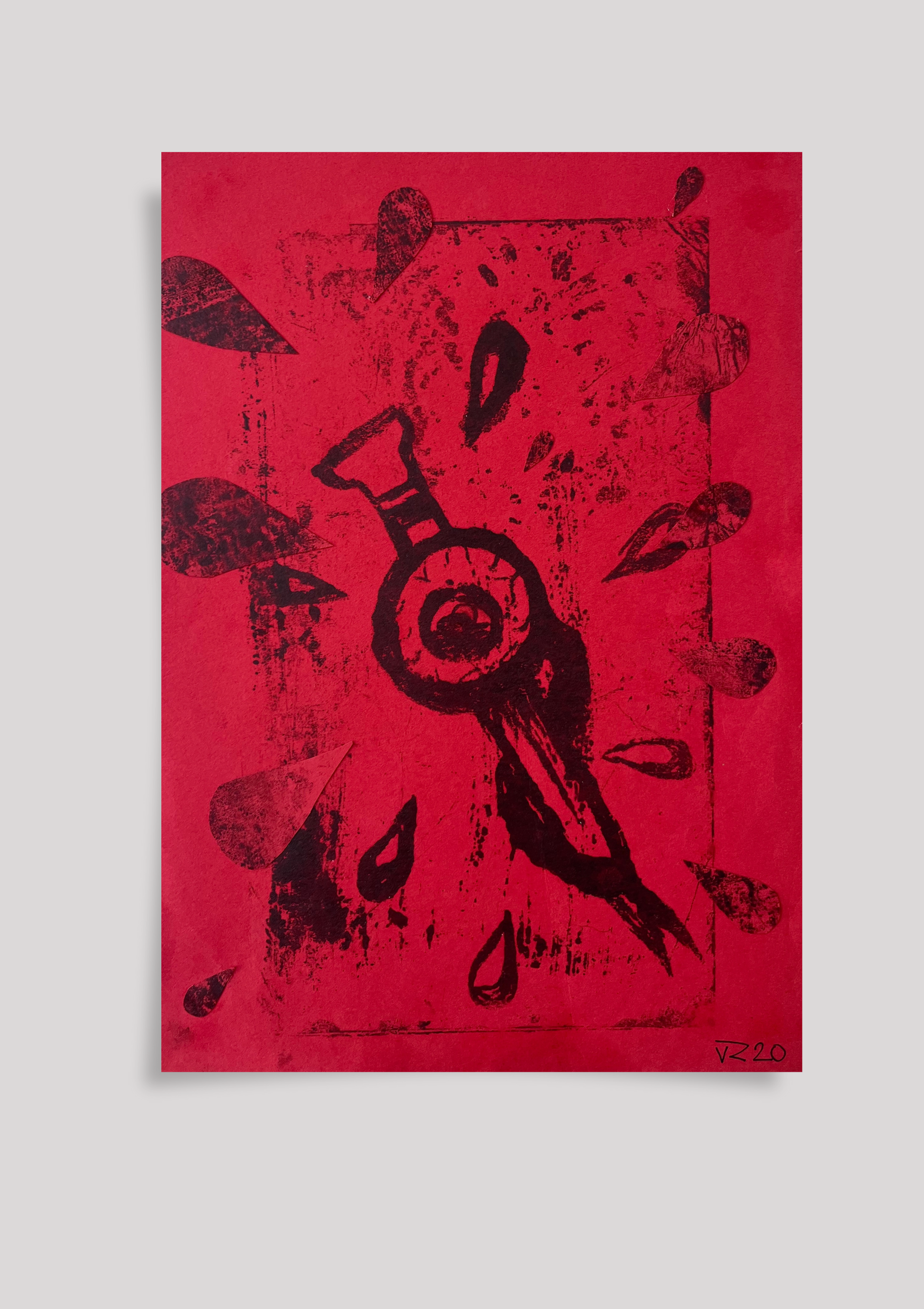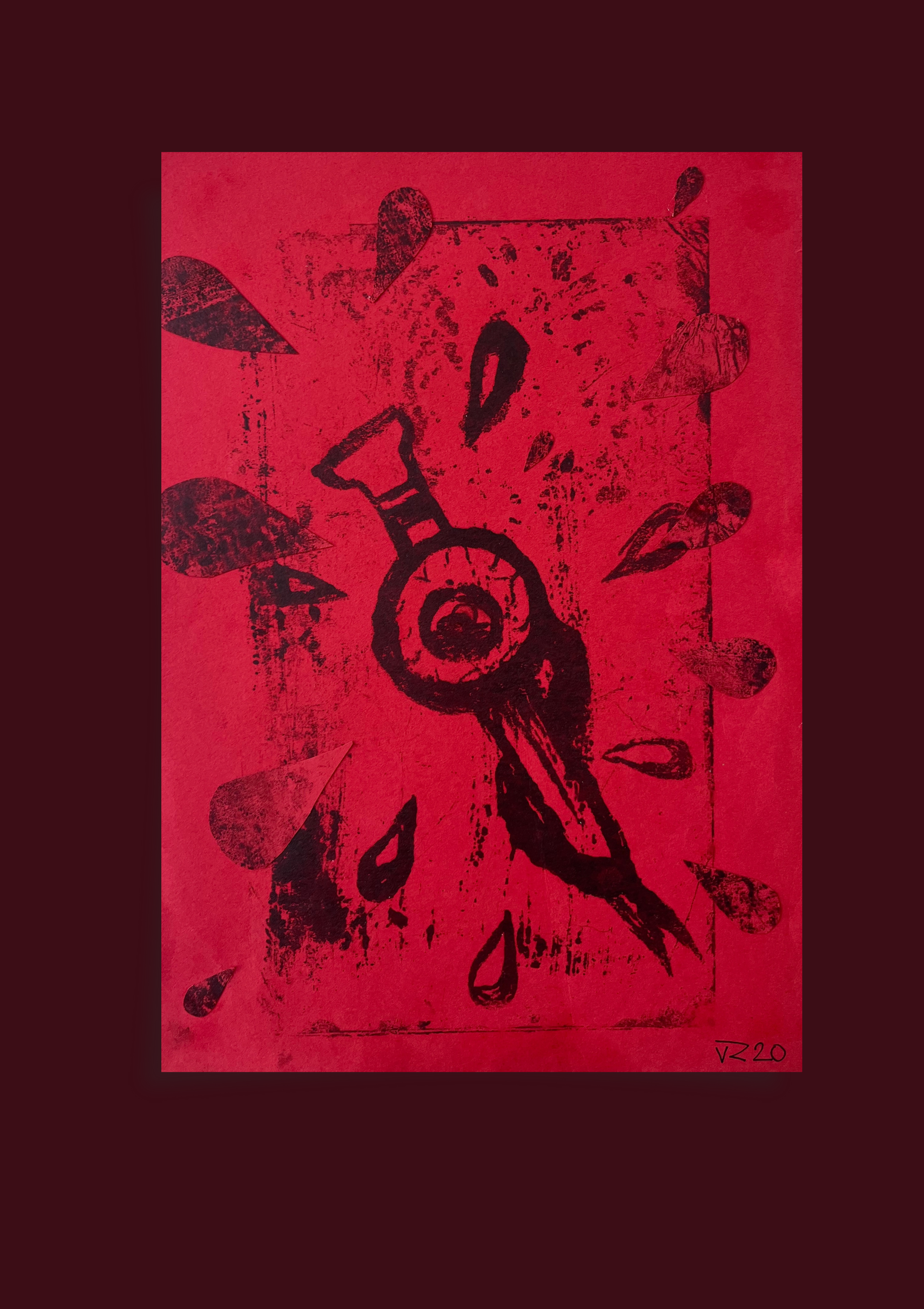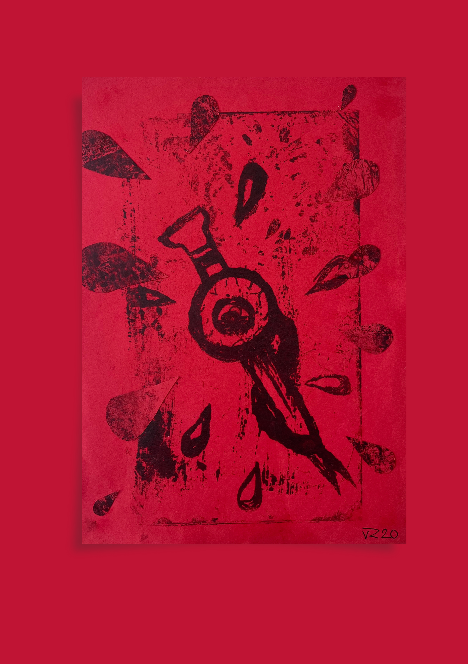 „Extraction 1“ ist ein kraftvolles Werk in Schwarz und Rot auf A4-Papier. Im Zentrum steht eine scharfkantige, metallisch wirkende Form, die wie ein Werkzeug, eine Schraube oder ein Dorn wirkt – umgeben von tropfenartigen Spuren, die an Blut oder Tränen erinnern.