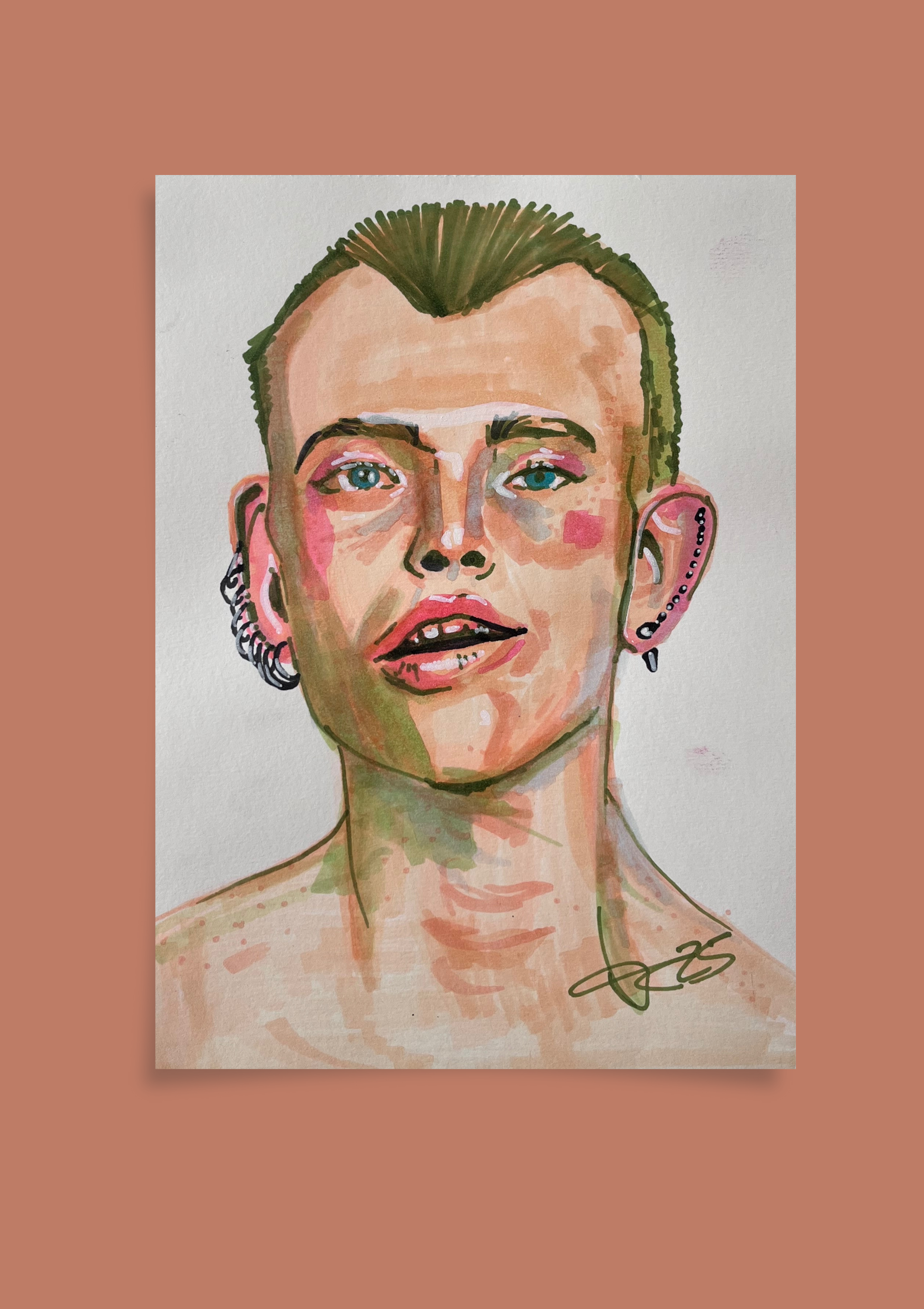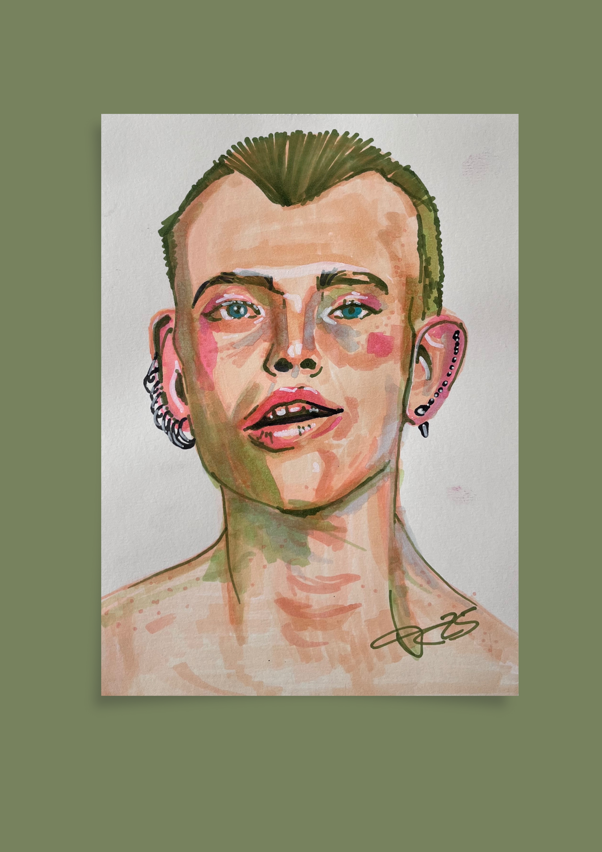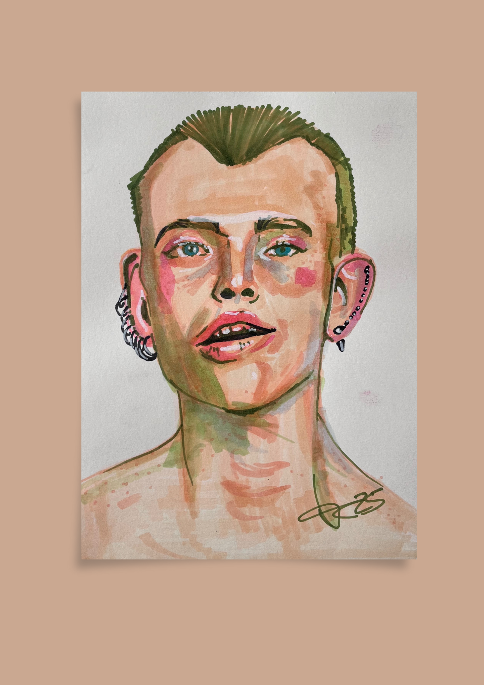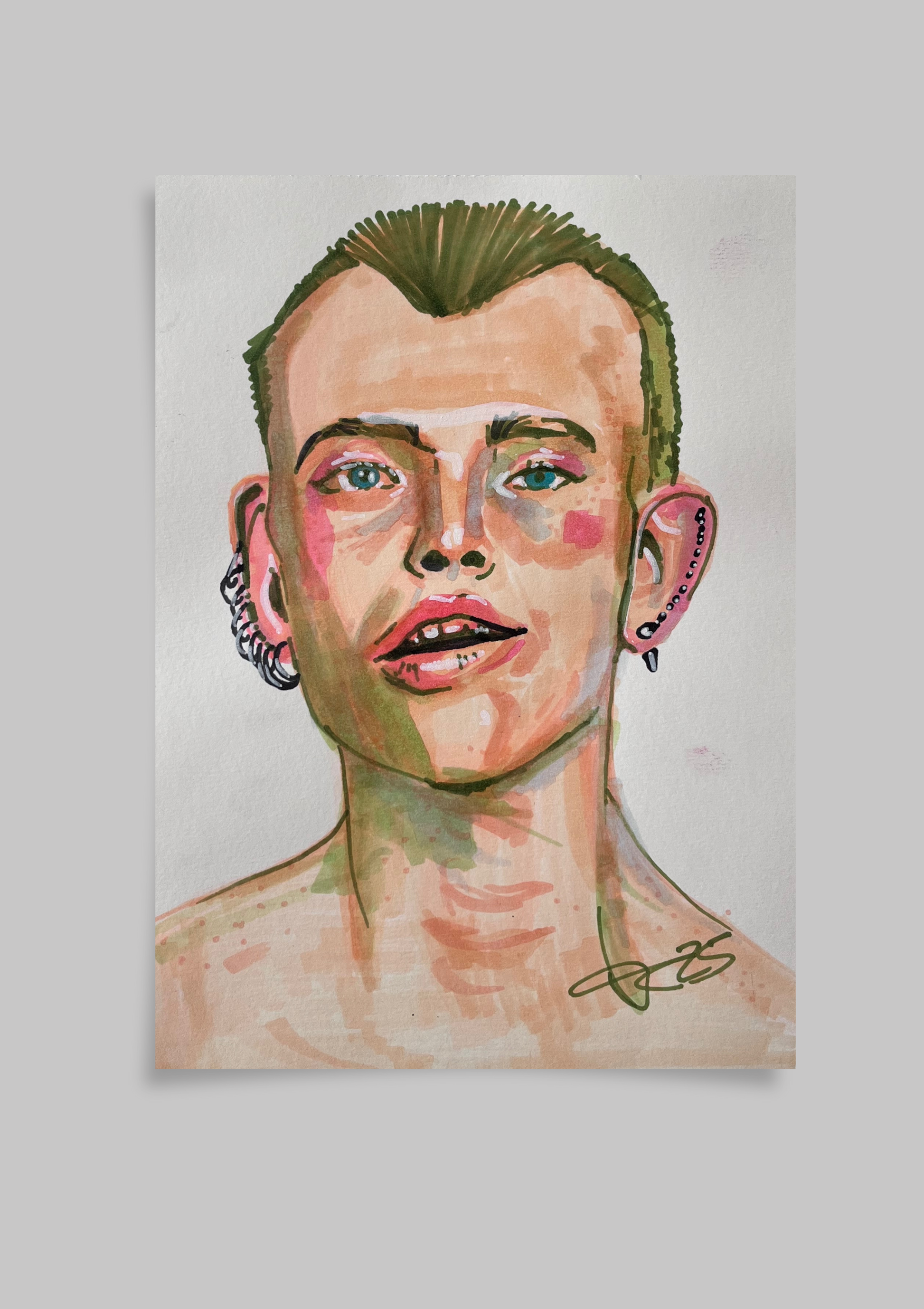 Modepunk“ ist ein expressives Porträt, entstanden mit Markern auf A4-Papier. Die Figur blickt den Betrachter direkt an – roh, ehrlich und voller Präsenz. Klare Linien, kontrastreiche Farbflächen und Details wie Schmuck und Kurzhaarschnitt verleihen ihr eine rebellische, zugleich stilbewusste Ausstrahlung.