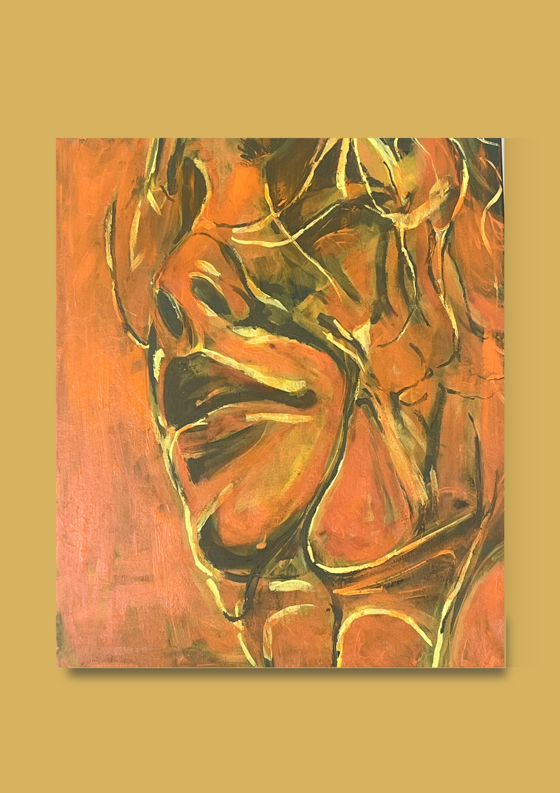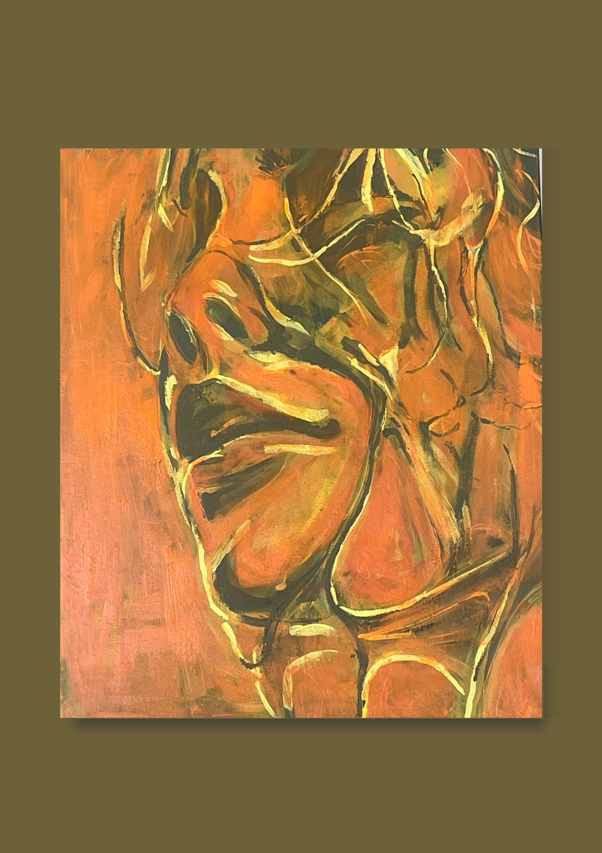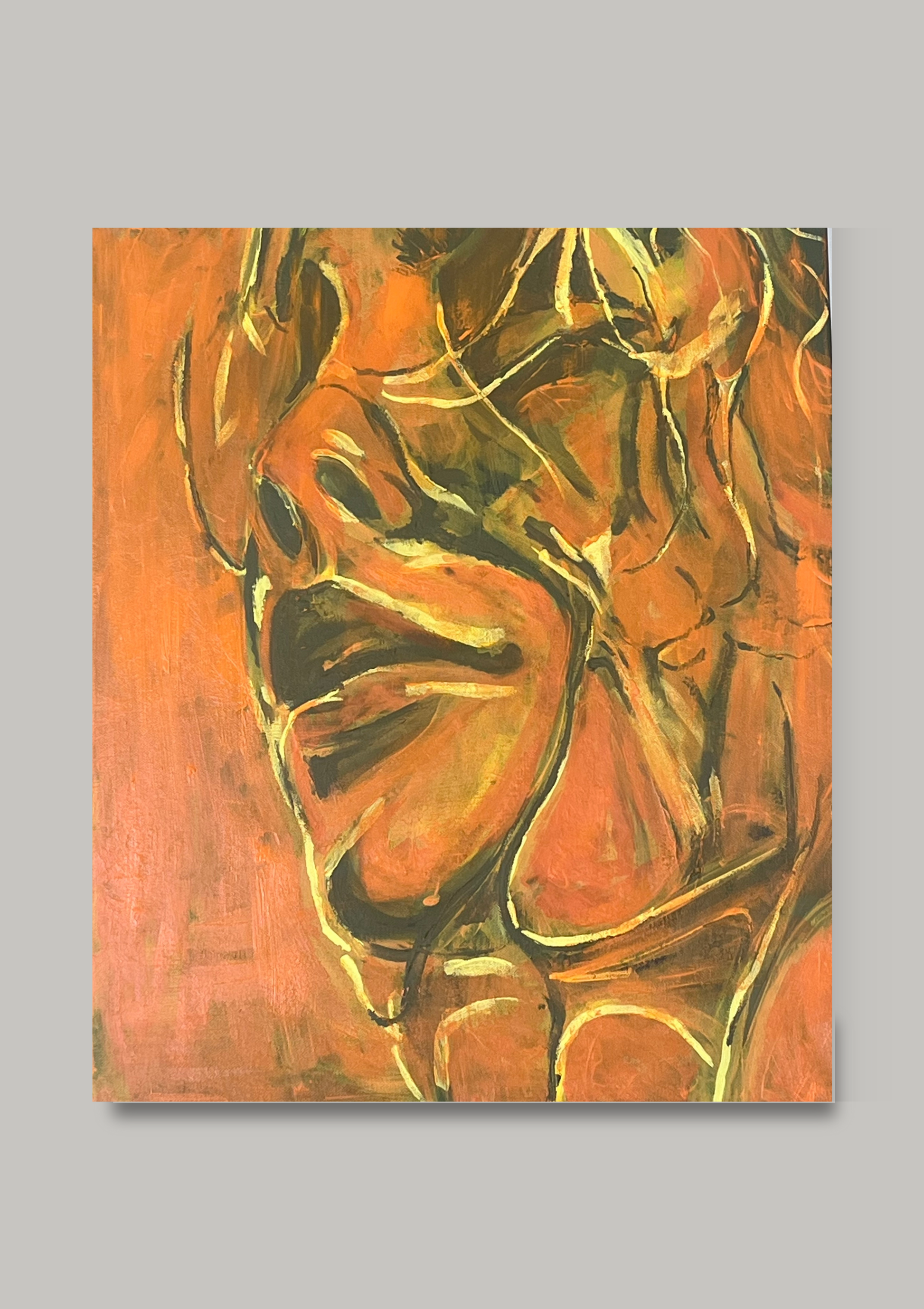 „Unter der Haut“ ist ein intensives Acrylgemälde, das mit warmen, erdigen Orangetönen und vibrierenden Linien Tiefe und Bewegung erzeugt.