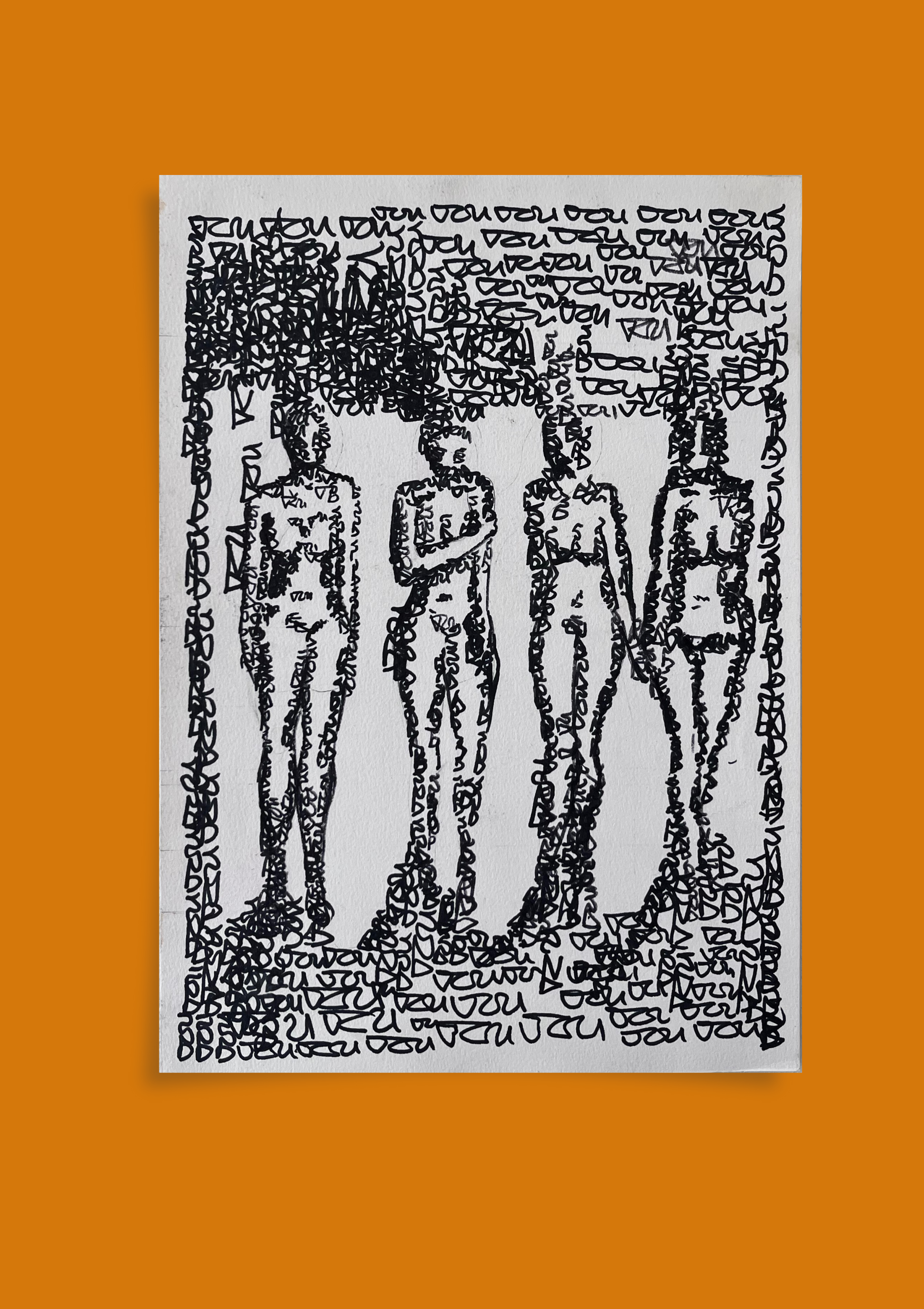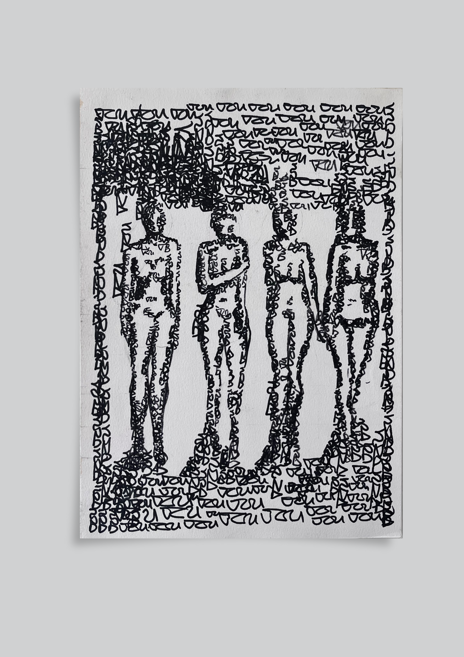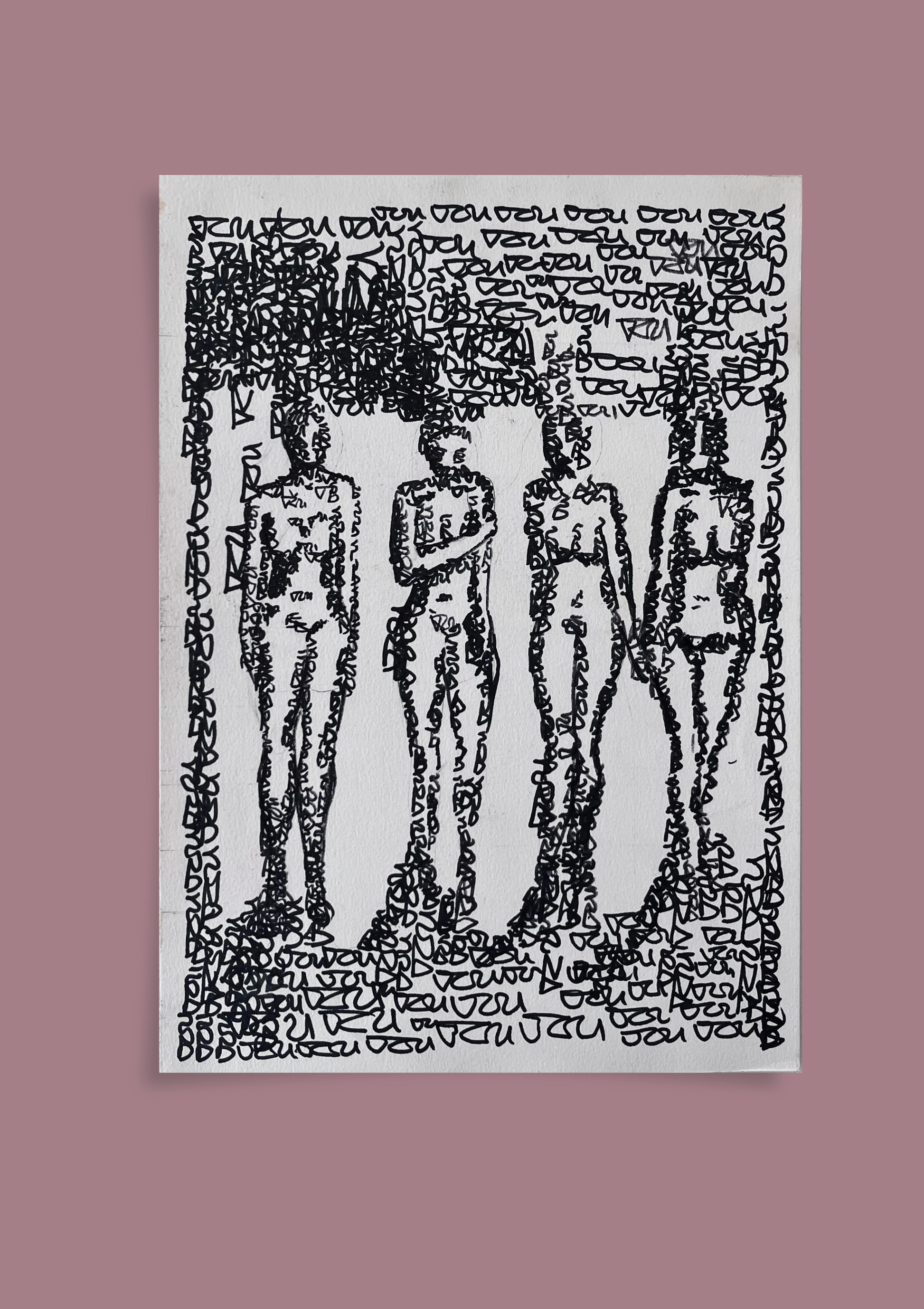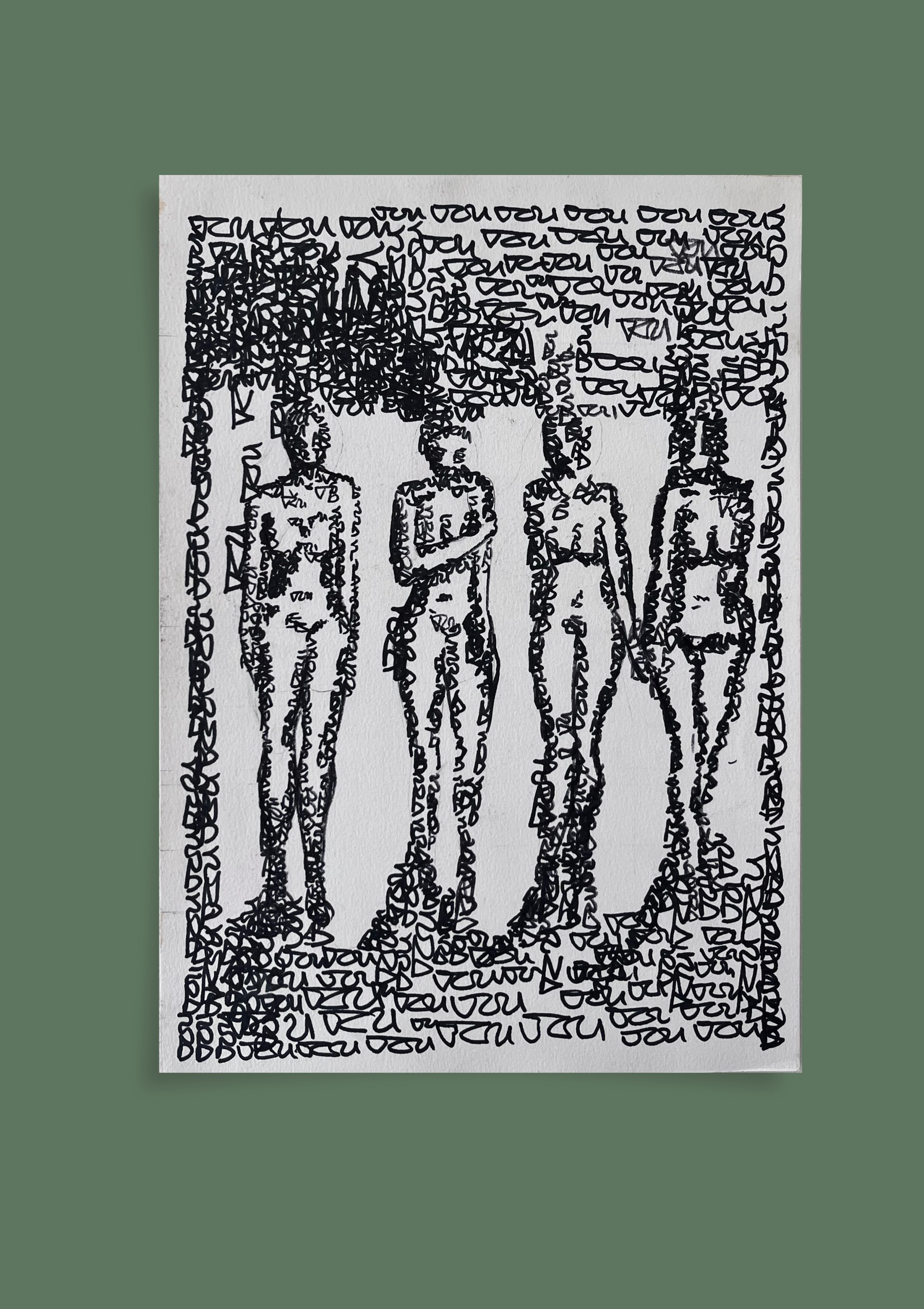 Das Bild „Verborgene Stimmen“ zeigt vier stehende Körper, deren Silhouetten vollständig aus dichter, handschriftartiger Zeichenstruktur bestehen. Die Figuren wirken zugleich klar umrissen und doch aufgelöst, als würden sie aus Sprache oder Stimmen bestehen, die keinen einzelnen Klang, sondern ein kollektives Rauschen bilden. Schwarz auf Weiß gehalten, entsteht ein eindringliches Spiel zwischen Präsenz und Unsichtbarkeit – zwischen dem, was sichtbar ist, und dem, was im Verborgenen mitschwingt.