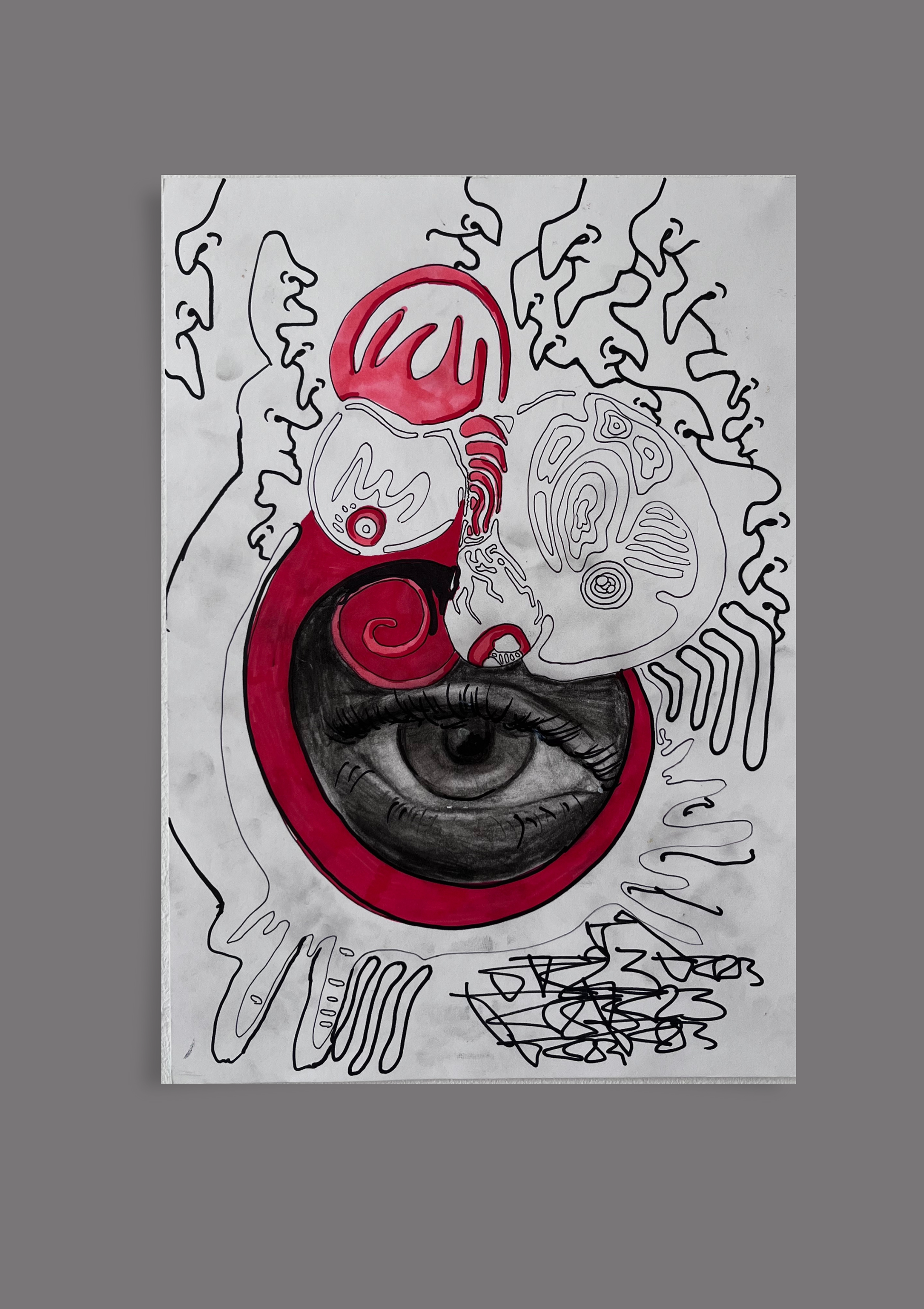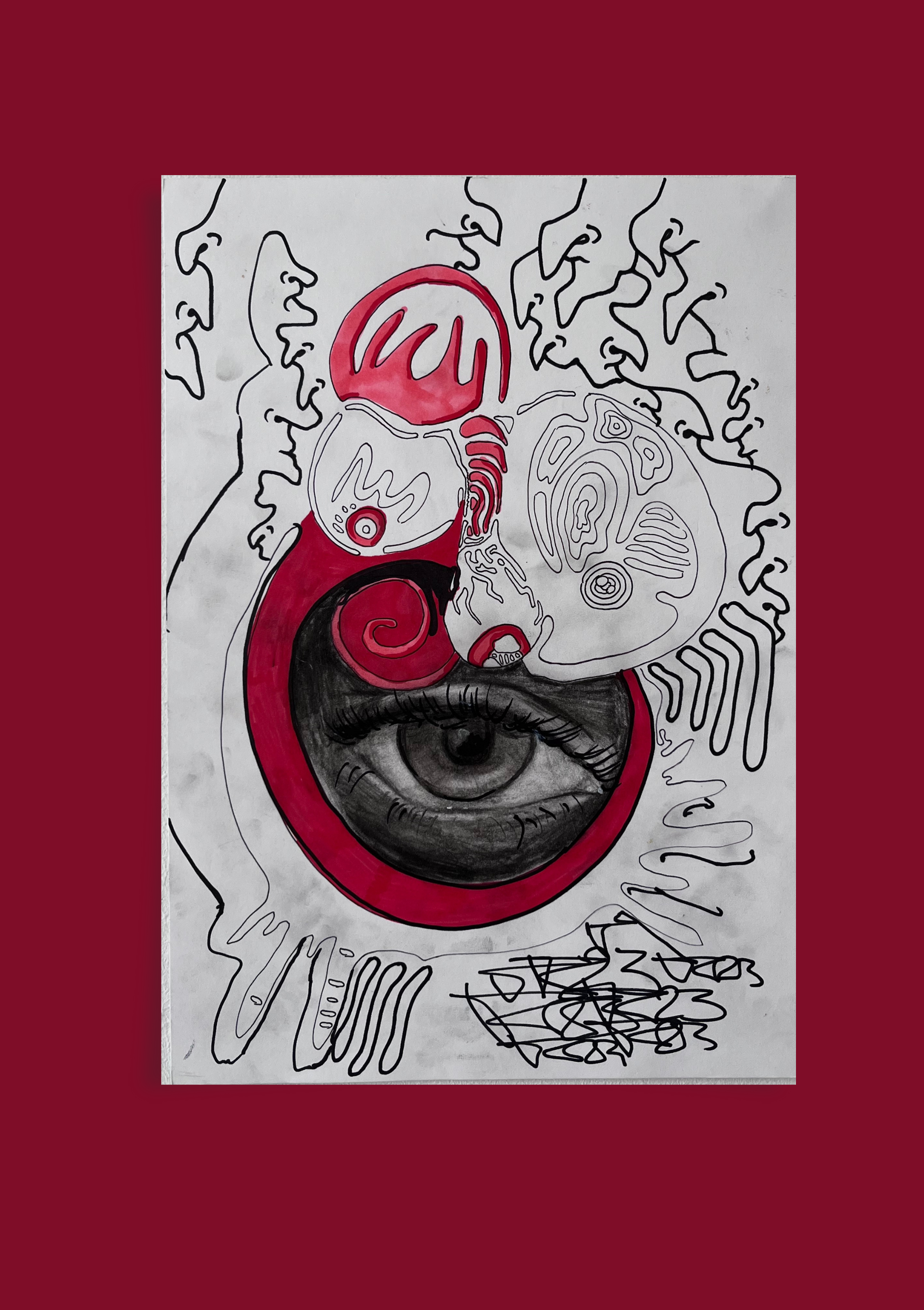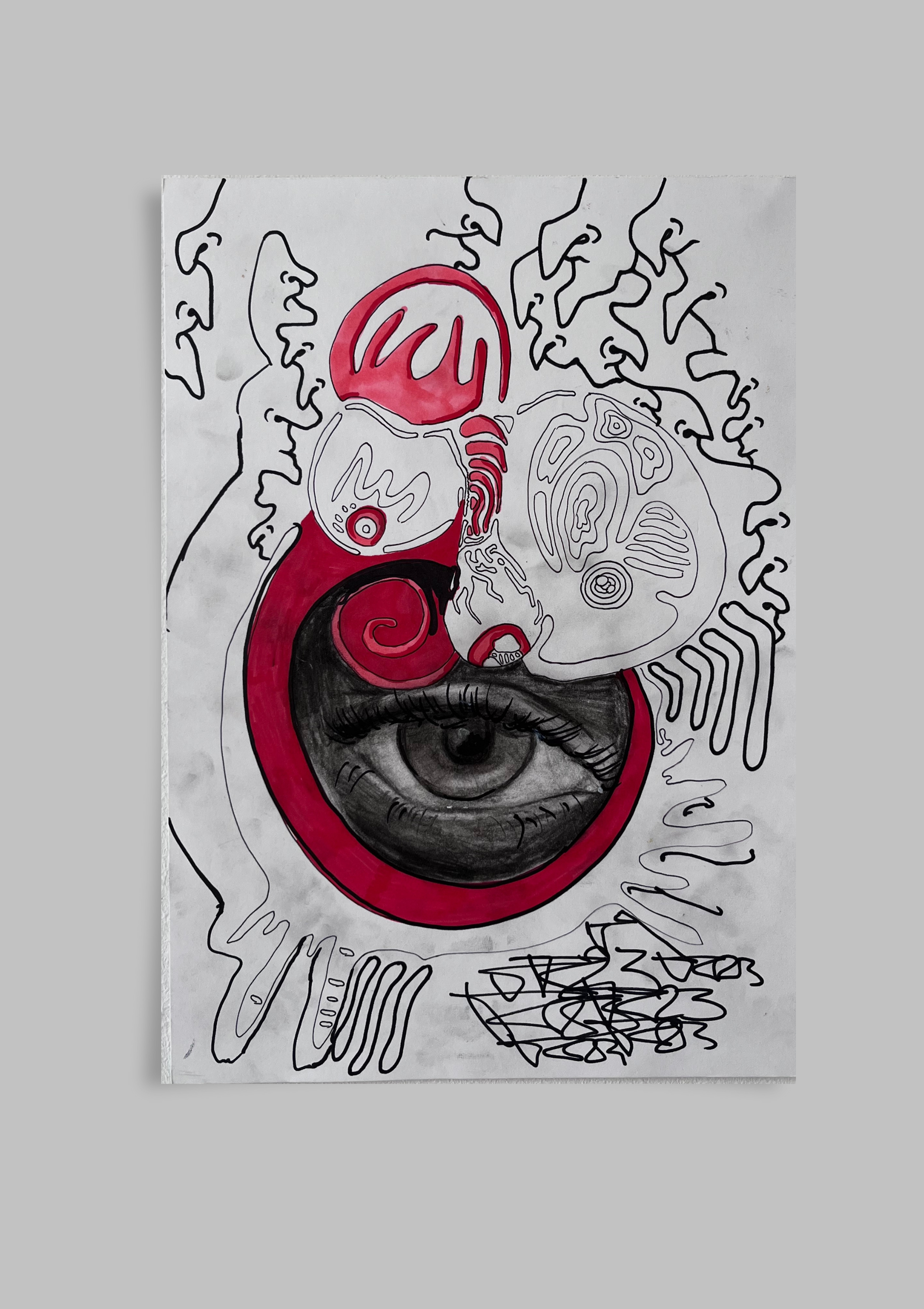 „Wachtraum“ Ein surreal anmutendes Werk, das zwischen Traum und Realität oszilliert. Klare Markerlinien verbinden sich mit fließenden Formen zu einer traumhaften Szenerie, in der das Unterbewusstsein sichtbar wird. Farbkontraste und fragmentierte Elemente erzeugen ein Gefühl von Schwebe – wie ein Moment zwischen Schlaf und Erwachen.