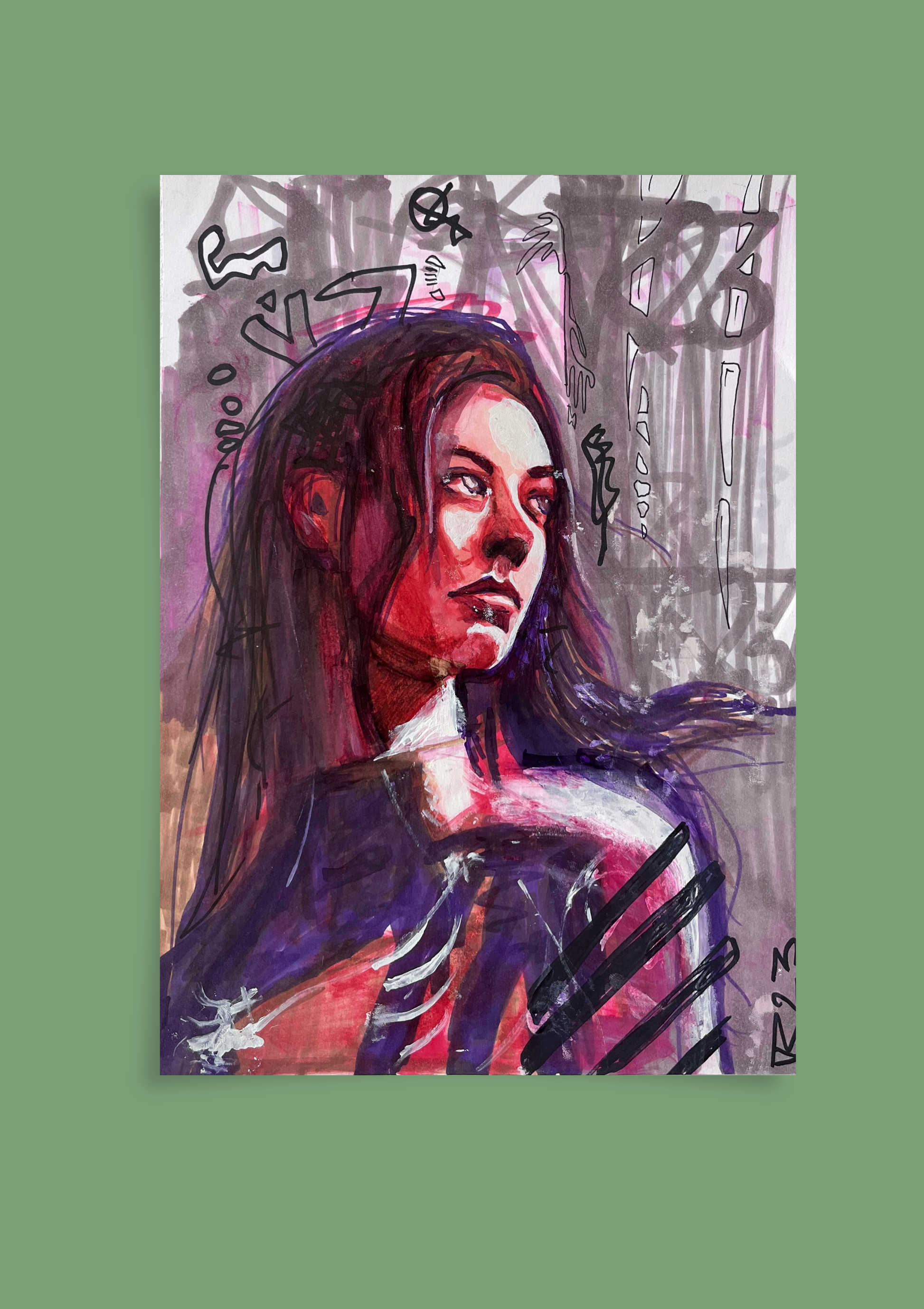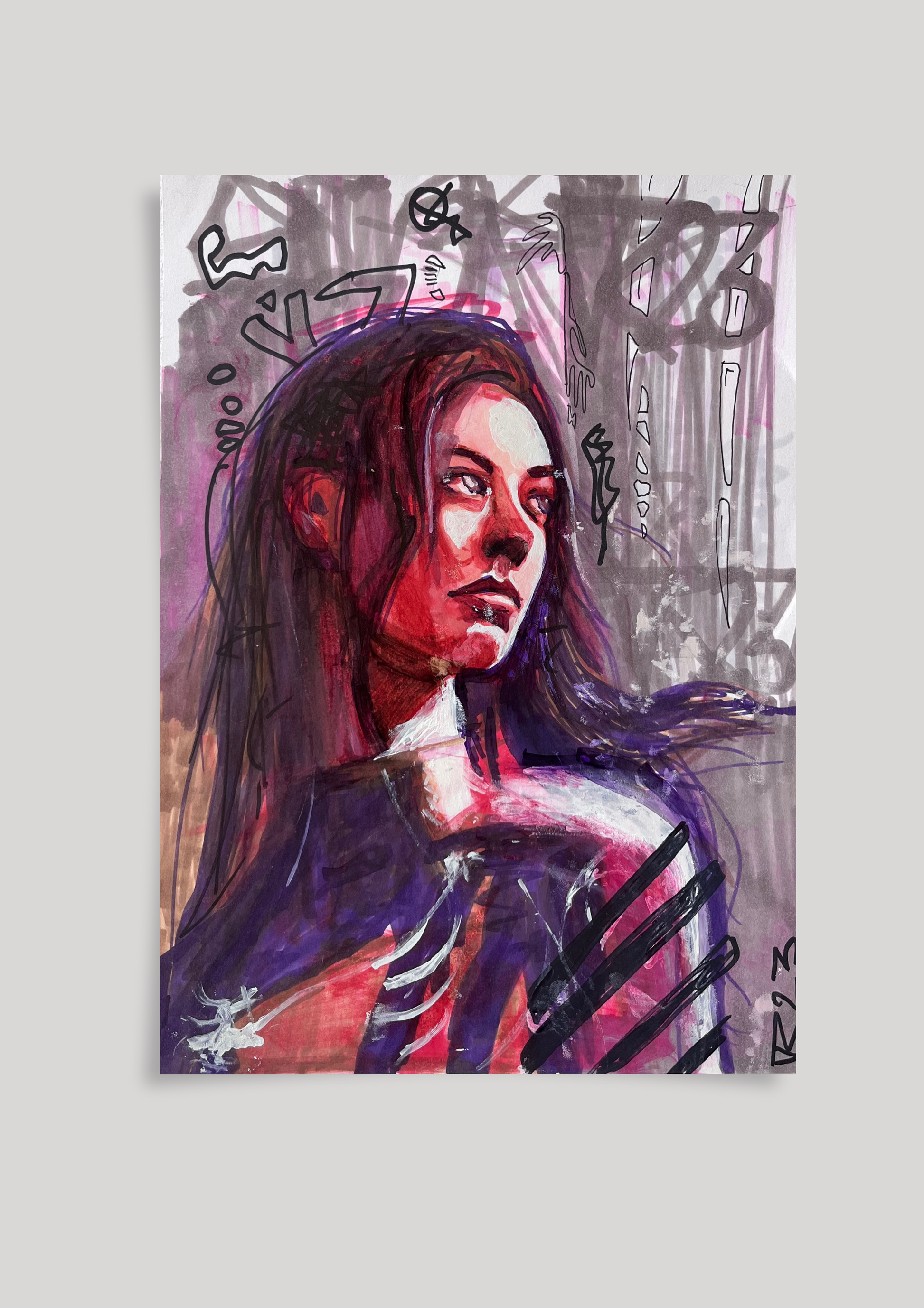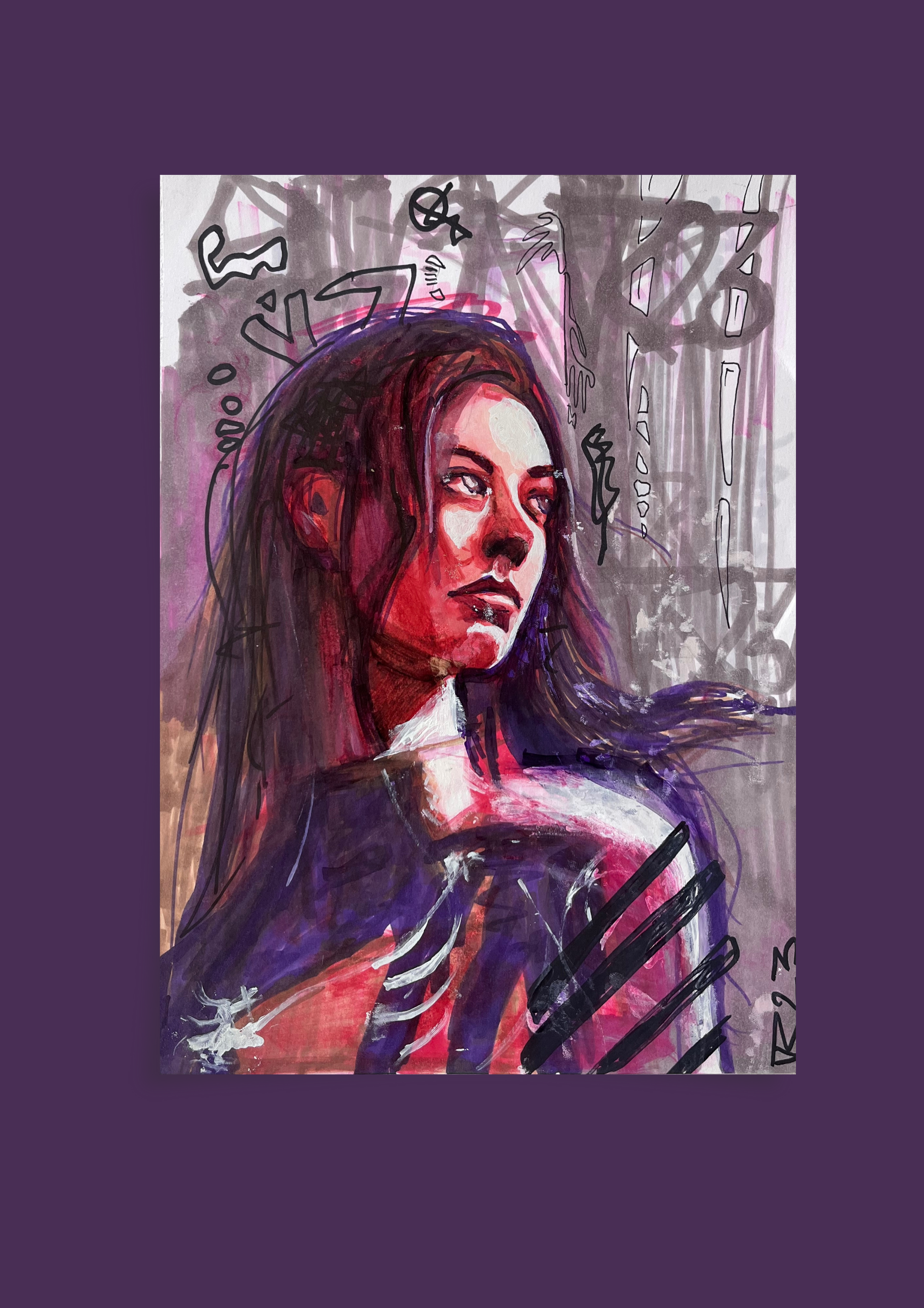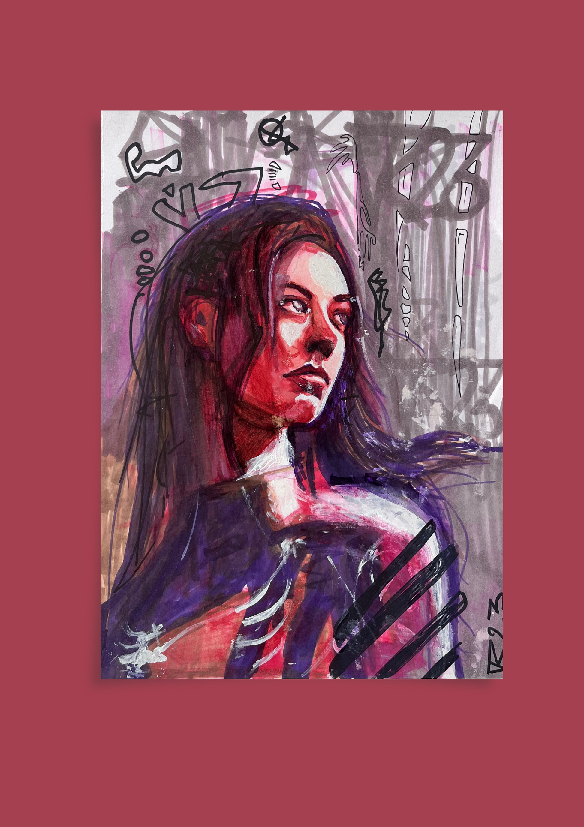 „Wiener Heldin“ Das Bild zeigt eine Frau in intensiven Rot- und Violetttönen, deren Blick nach oben gerichtet ist – suchend, nachdenklich, fast entrückt. Die Konturen sind roh und kraftvoll, die Haut wirkt von innerem Feuer durchzogen. Im Hintergrund brechen abstrakte, grauschwarze Zeichen und Linien hervor, wie ein Geflecht aus Chaos und Energie. Das Werk vereint Verletzlichkeit und Stärke, innere Zerrissenheit und Widerstandskraft.